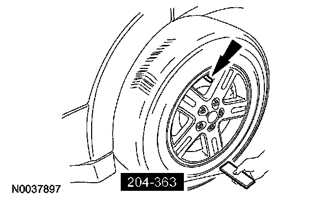Place the activation tool on the LF tire sidewall opposite (180 degrees) from the valve stem. Press and release the test button on the special tool. The horn will sound briefly to indicate that the tire pressure sensor has been recognized by the smart junction box (SJB).