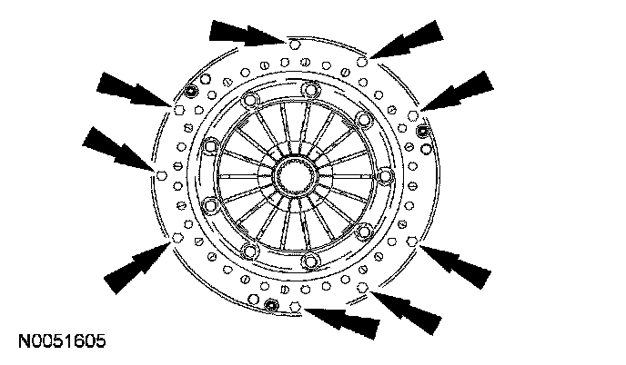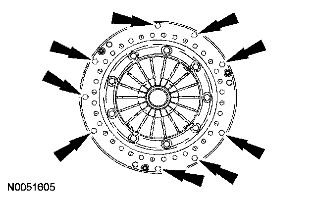 Remove the 9 pressure plate bolts, the pressure plate and the clutch disc. Discard the pressure plate bolts.