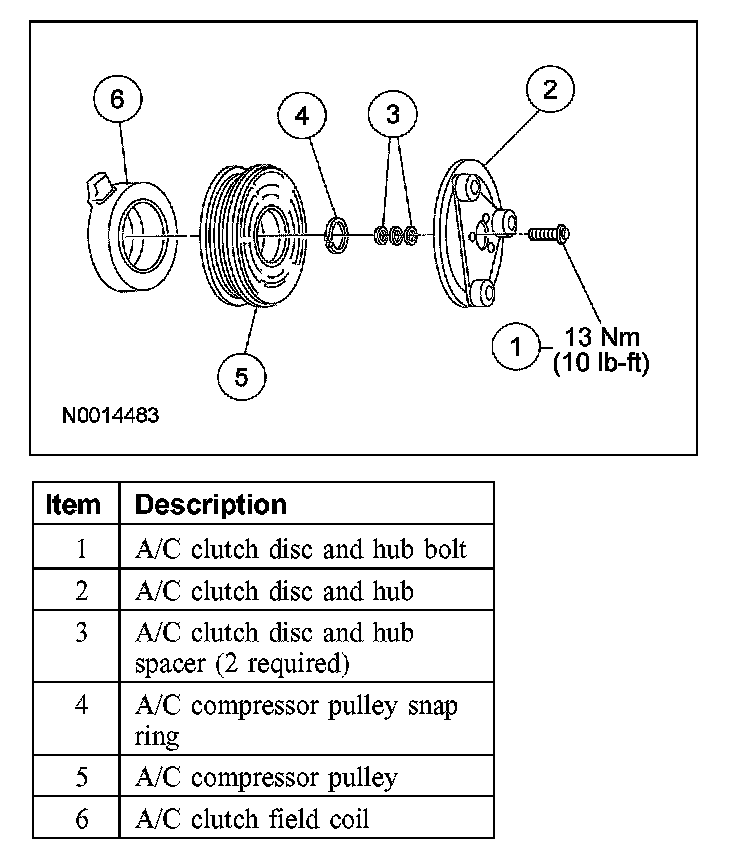 4. NOTE: The A/C clutch pulley is a tight fit on the A/C compressor head. It must be correctly aligned during installation.