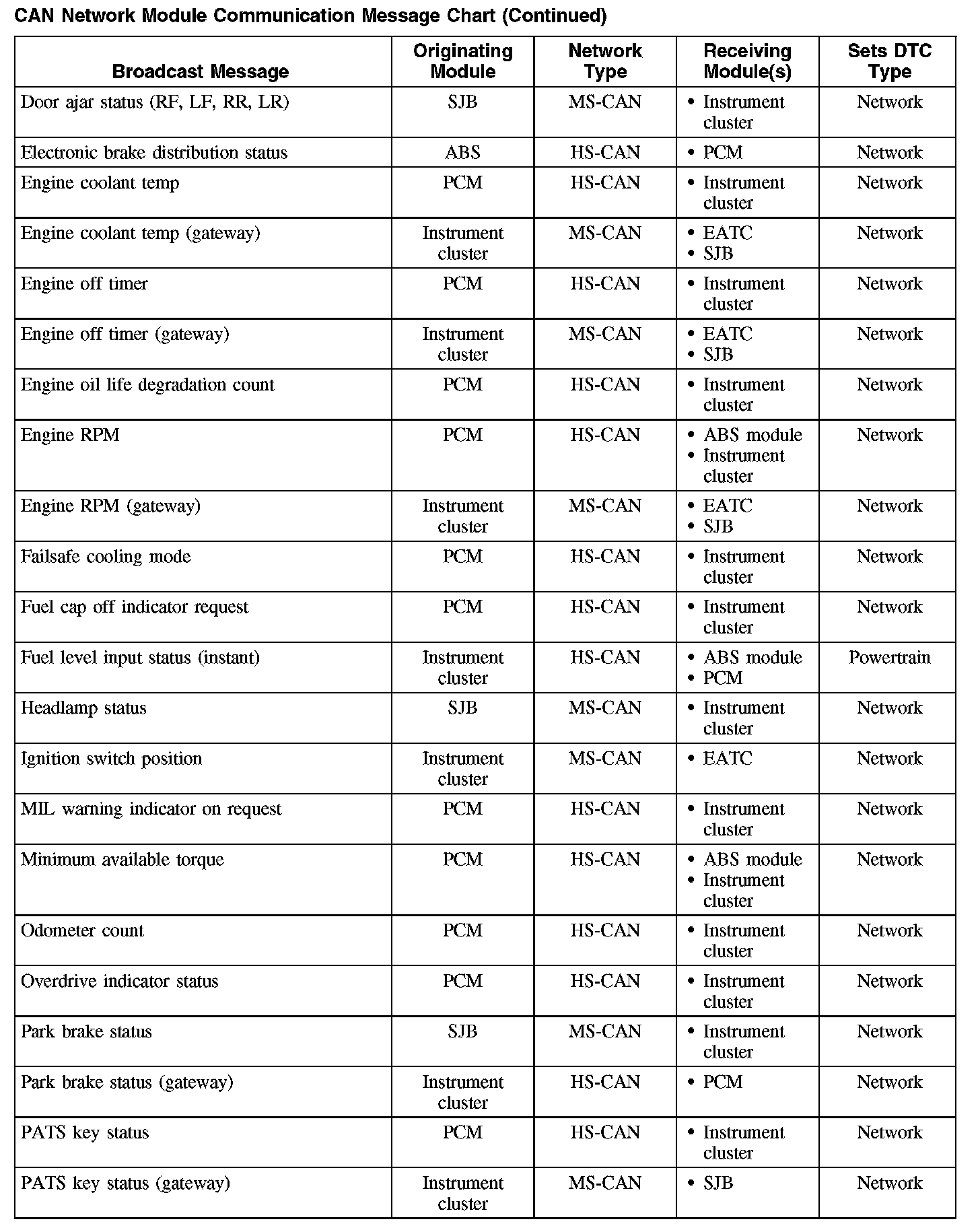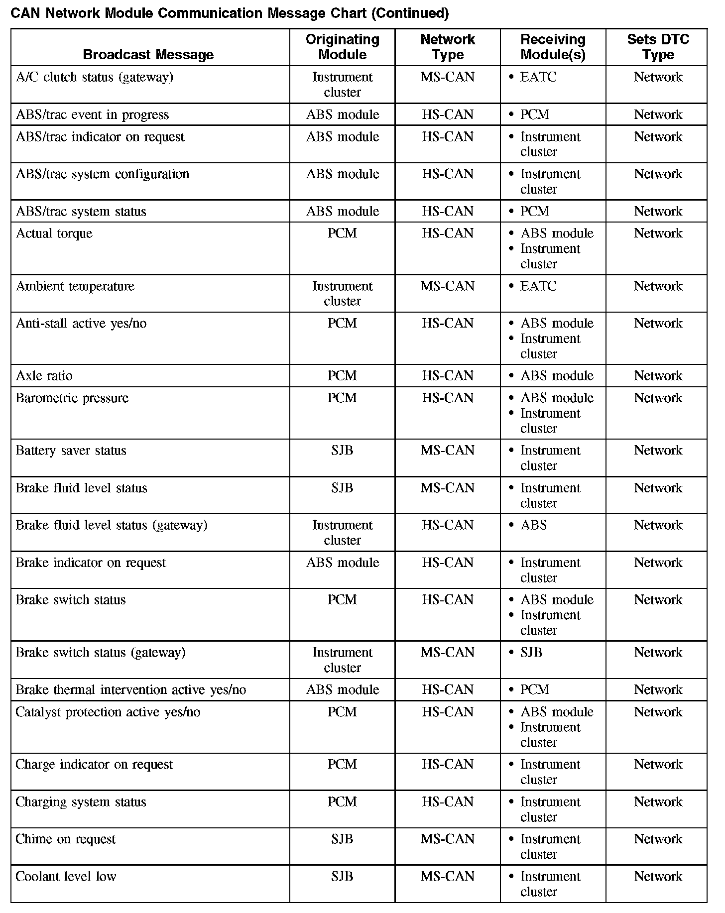 The chart describes the specific CAN network messages broadcast by each module, and the module(s) that receive the message.