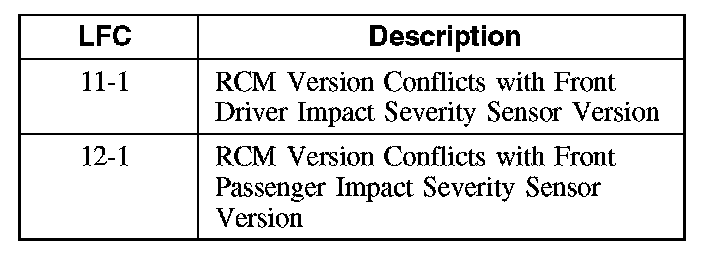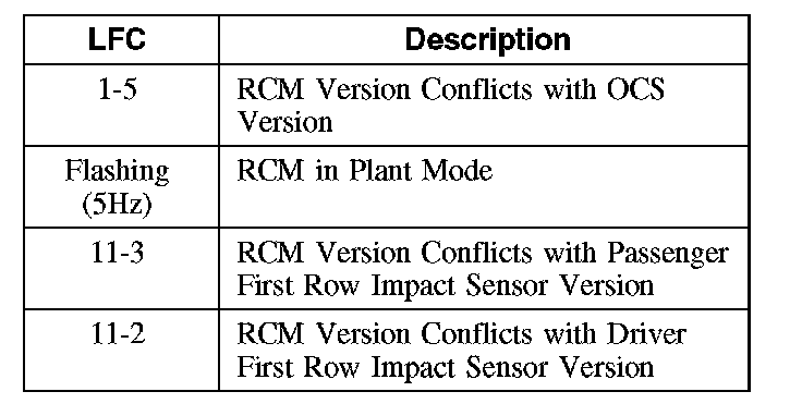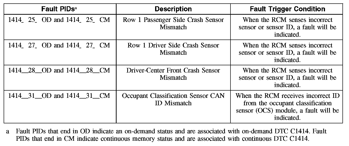 If the RCM receives conflicting information from the impact sensors or OCS system it will store DTC C1414 in memory and, depending on the fault, flash a LFC on the air bag warning indicator. The secondary air bag warning chime will also be activated.