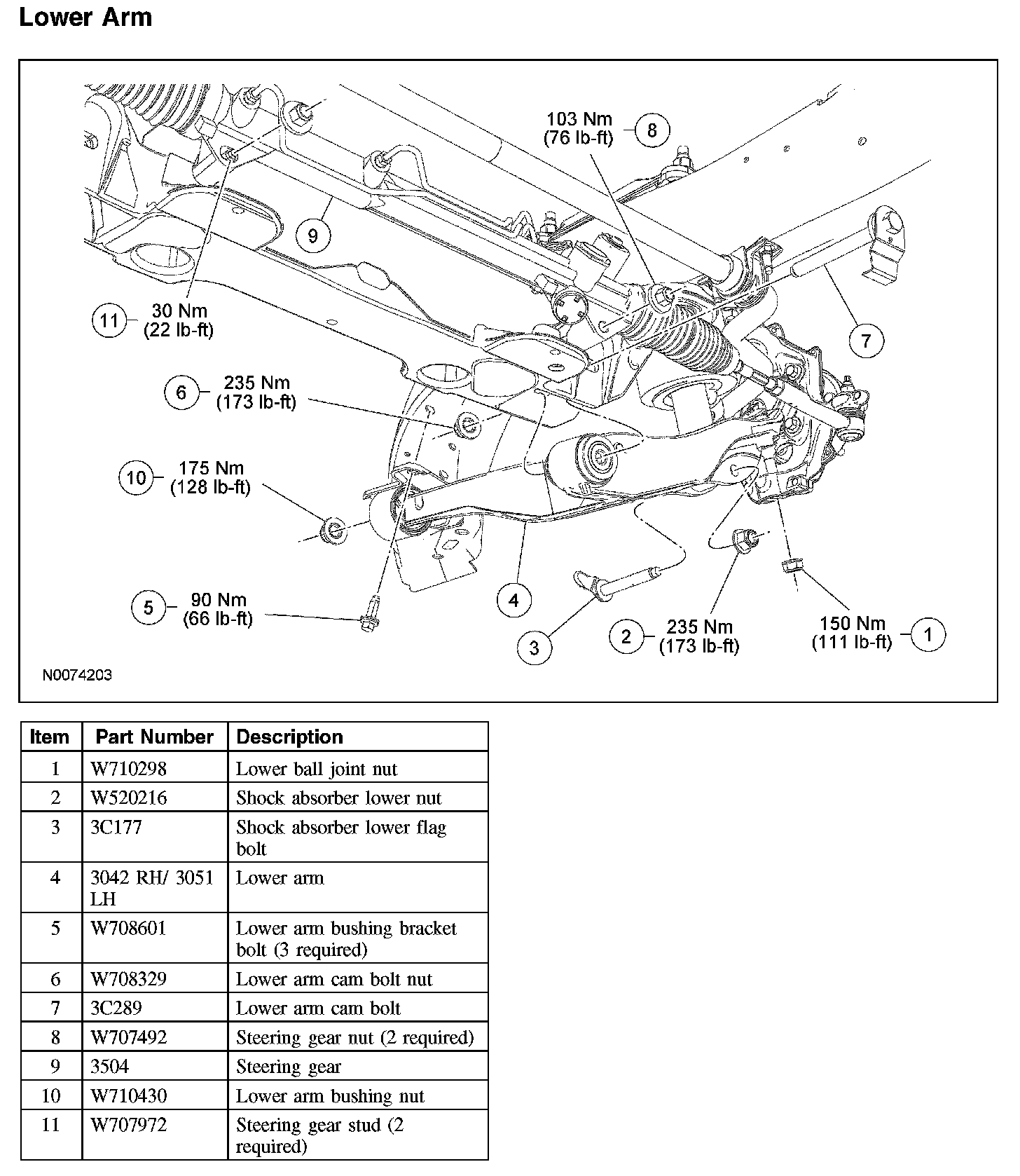11. If a new lower control arm is being installed, tighten the bushing retaining nut to 175 Nm (128 lb-ft).