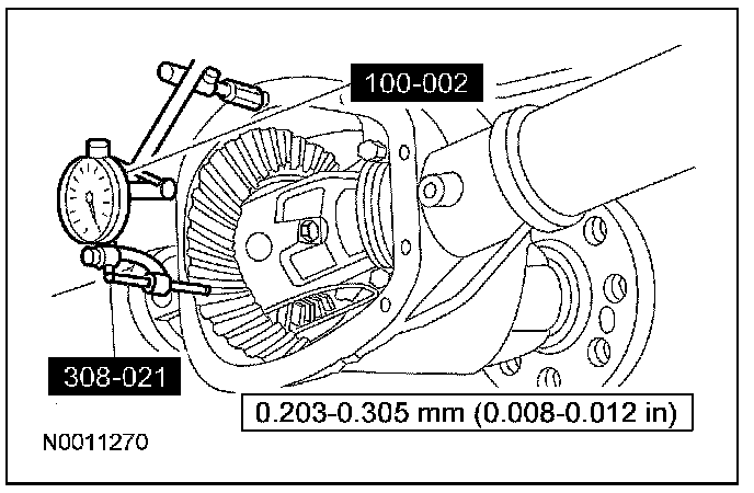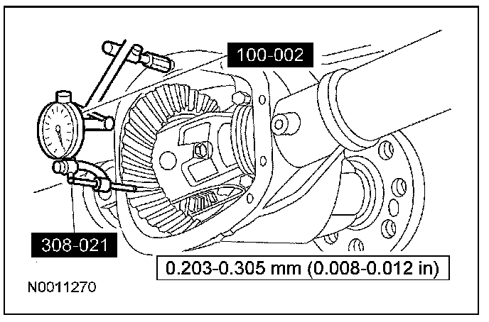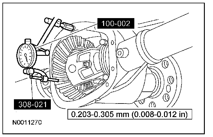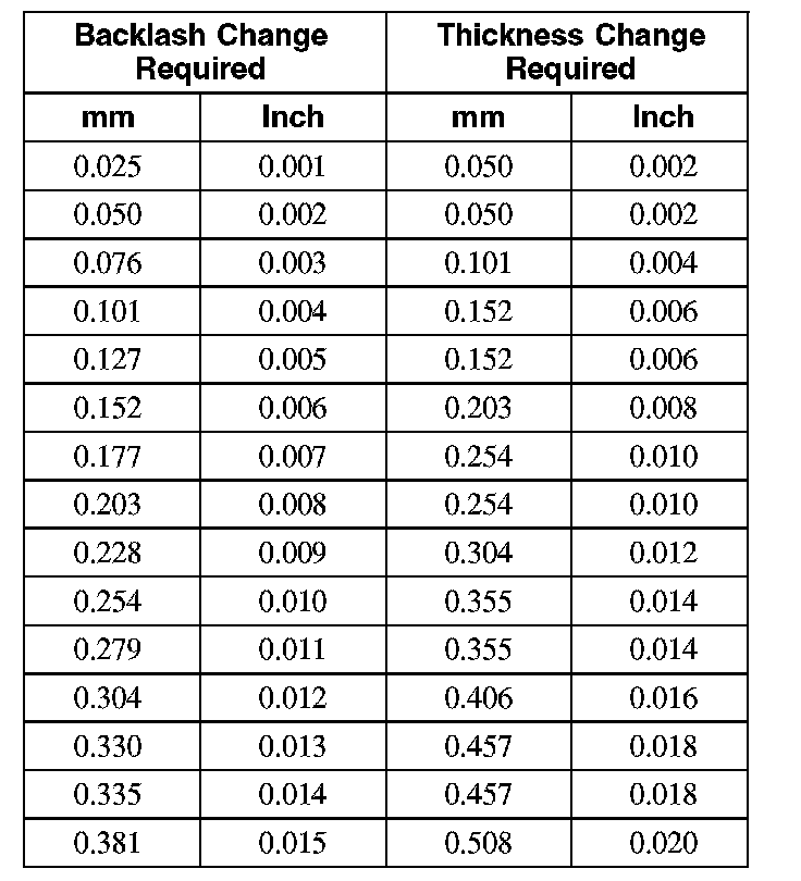 11. If a zero backlash condition occurs, add 0.51 mm (0.020 inch) to the RH side and subtract 0.51 mm (0.020 inch) from the LH side to allow backlash indication. Measure the backlash. Refer to Measuring backlash in this procedure.