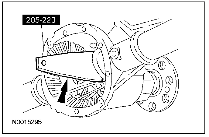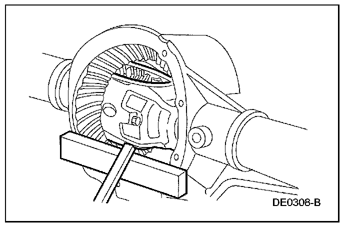 CAUTION: Place a wood block between the pry bar and the differential housing to protect the machined surface from damage.