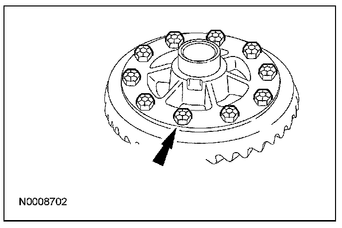8. NOTE: Do not damage the differential ring gear bolt hole threads.