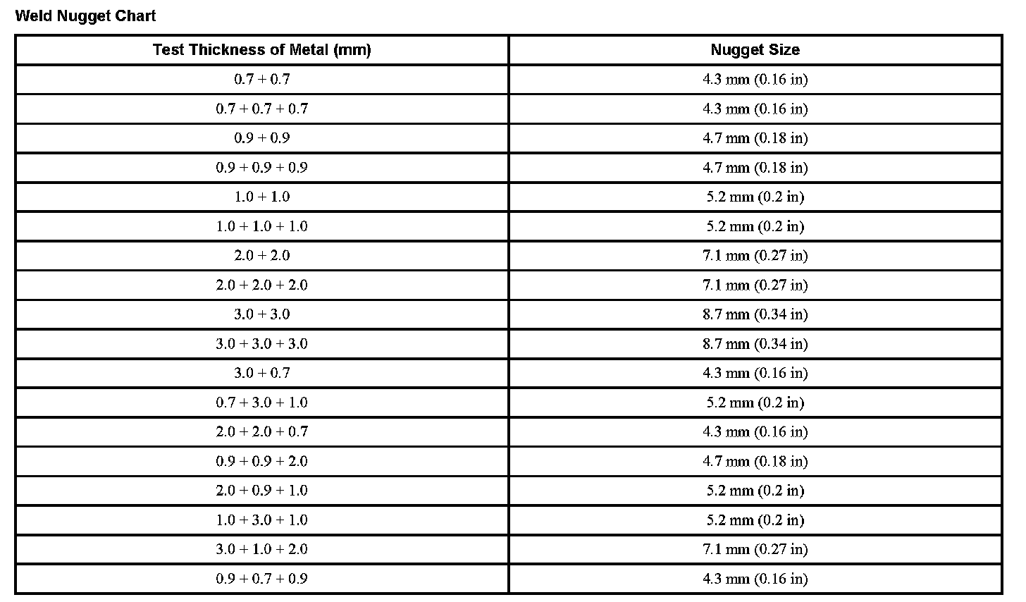 Weld Nugget Chart