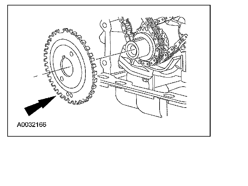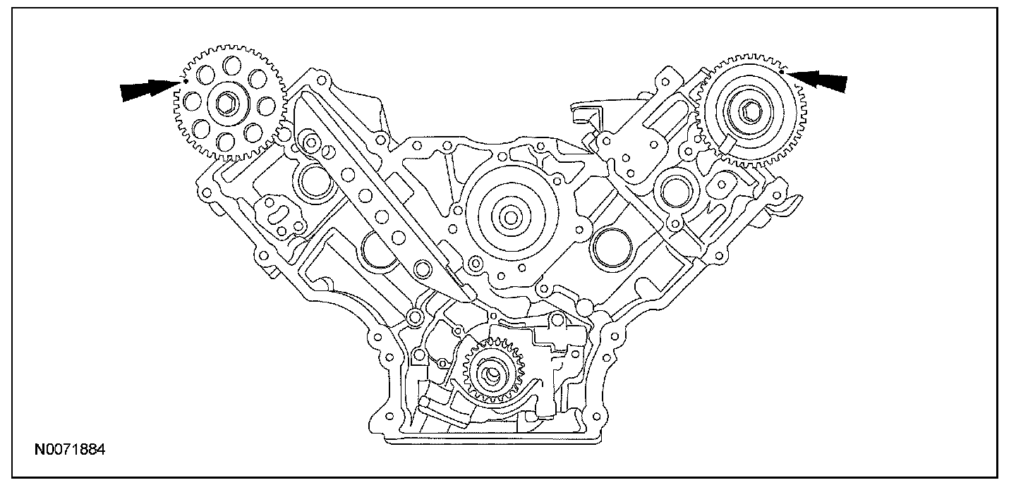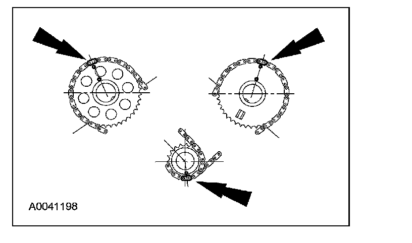 13. Rotate the RH camshaft sprocket until the timing mark is approximately at the 11 o'clock position. Rotate the LH camshaft sprocket until the timing mark is approximately at the 1 o'clock position.