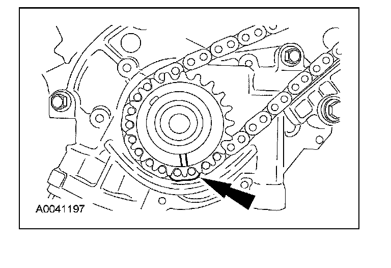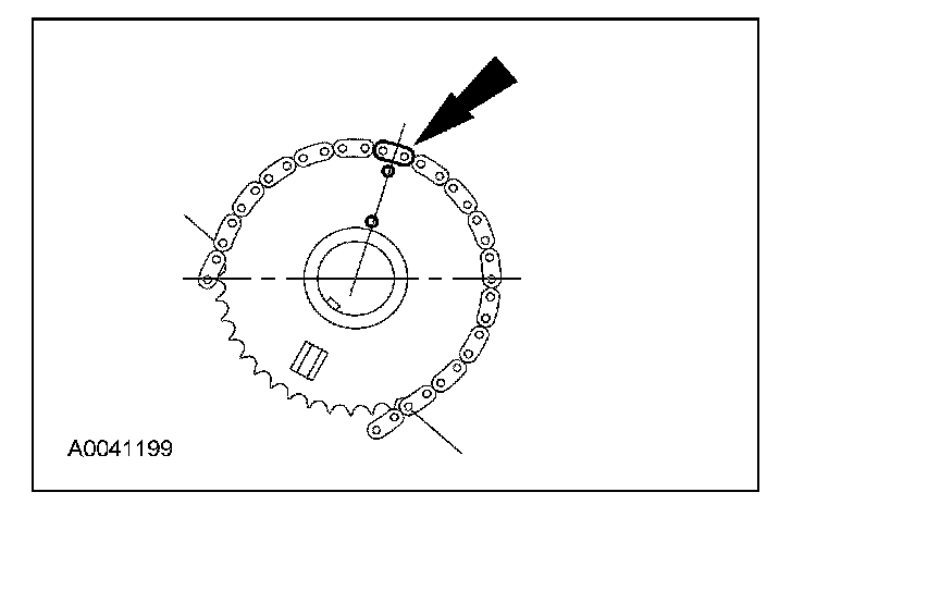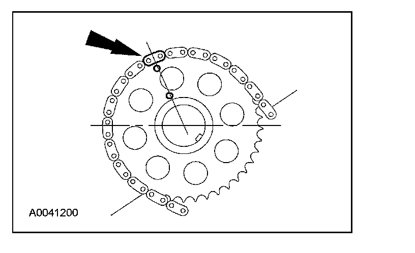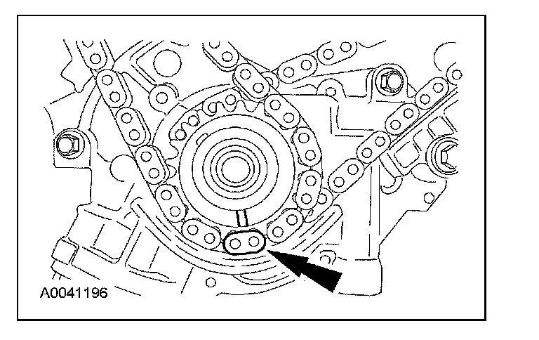 14. Position the LH (inner) timing chain on the crankshaft sprocket, aligning the colored (marked) link with the timing mark on the sprocket.