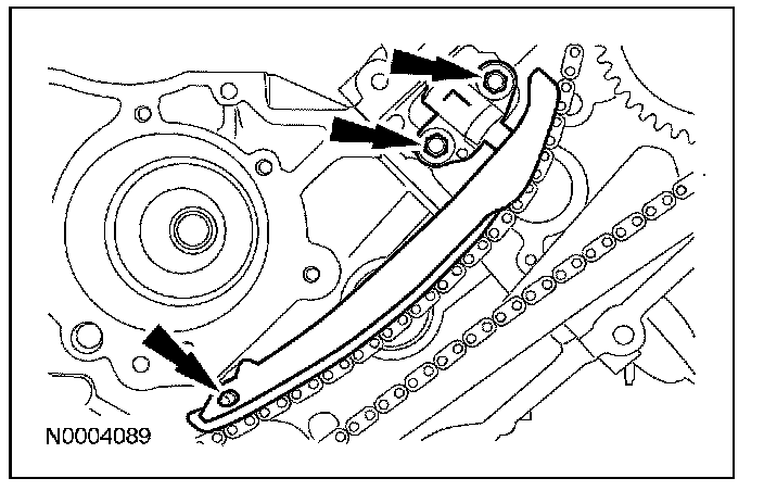 Position the LH timing chain tensioner arm on the dowel pin and install the LH timing chain tensioner.