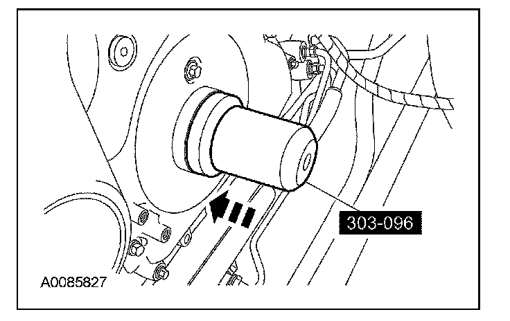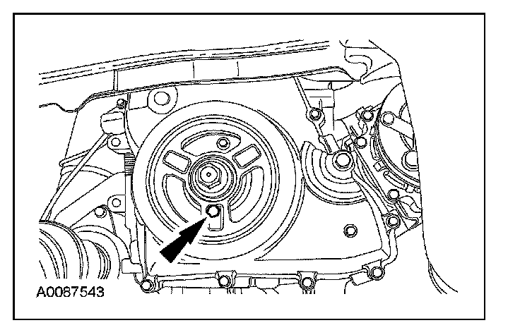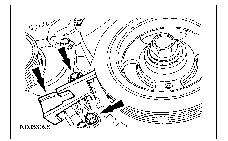 CAUTION: Do not loosen or remove the crankshaft pulley bolt without first installing the special tools as instructed in this procedure. The crankshaft pulley and the crankshaft timing sprocket are not keyed to the crankshaft. The crankshaft, the crankshaft sprocket and the pulley are fitted together by friction, using diamond washers between the flange faces on each part. For that reason, the crankshaft sprocket is also unfastened if the pulley bolt is loosened. Before any repair requiring loosening or removal of the crankshaft pulley bolt, the crankshaft and camshafts must be locked in place by the special service tools, otherwise severe engine damage can occur.