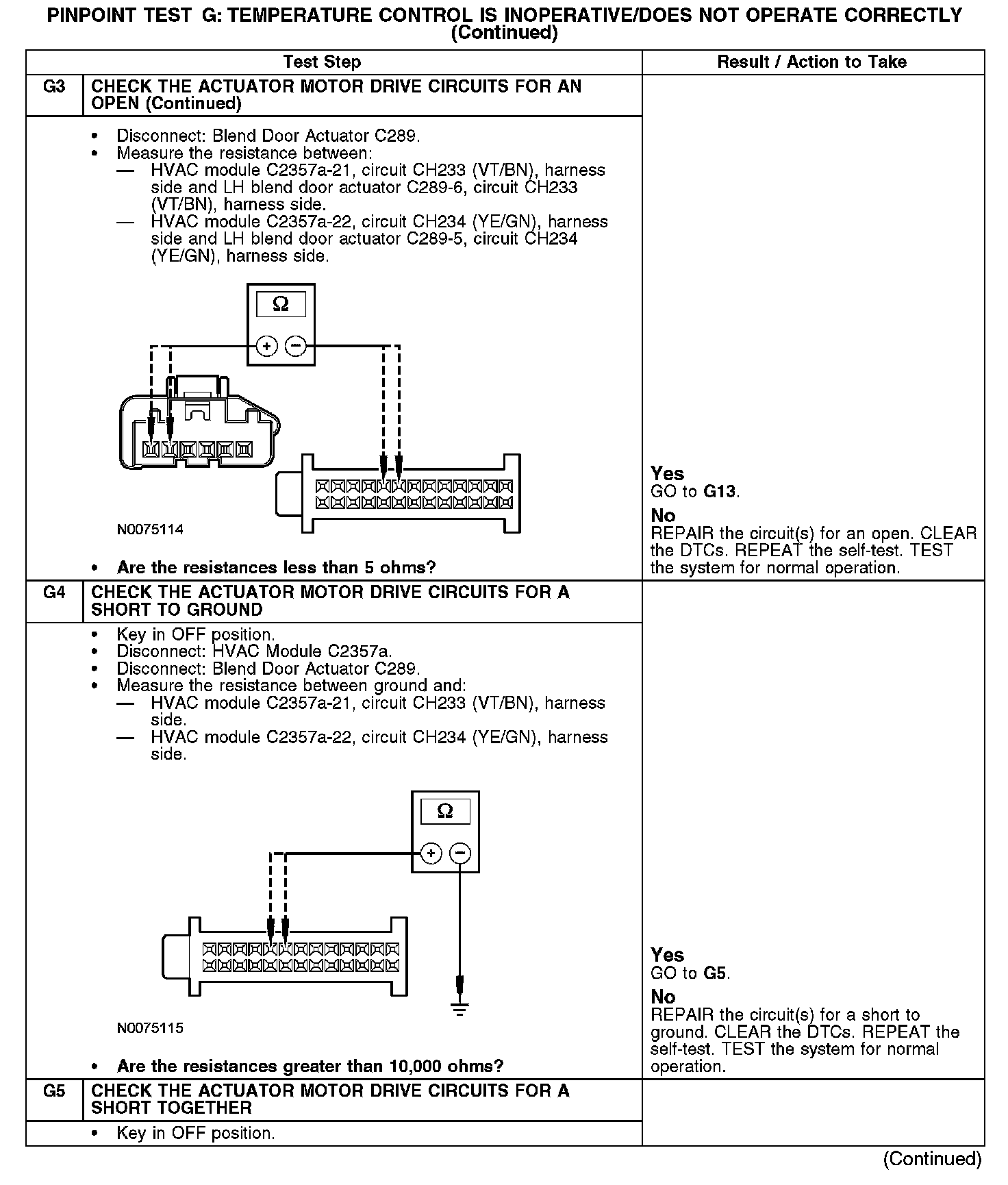 Under normal operation, to rotate the blend door actuator clockwise, the HVAC module supplies voltage to the blend door actuator motor through circuit CH233 (VT/BN), and supplies ground through circuit CH234 (YE/GN). To rotate the blend door actuator counterclockwise, the HVAC module reverses the voltage and ground circuits.