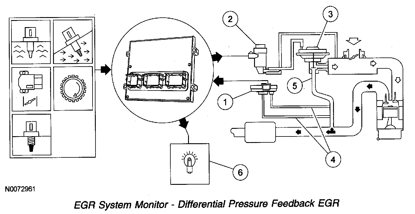 5. The EGR flow rate test is carried out during a steady state when the engine speed and load are moderate and the EGR vacuum regulator duty cycle is high. The monitor compares the actual differential pressure feedback EGR circuit voltage to a desired EGR flow voltage for that state to determine if the EGR flow rate is acceptable or insufficient. This is a system test and may trigger a DTC for any concern causing the EGR system to not operate correctly.