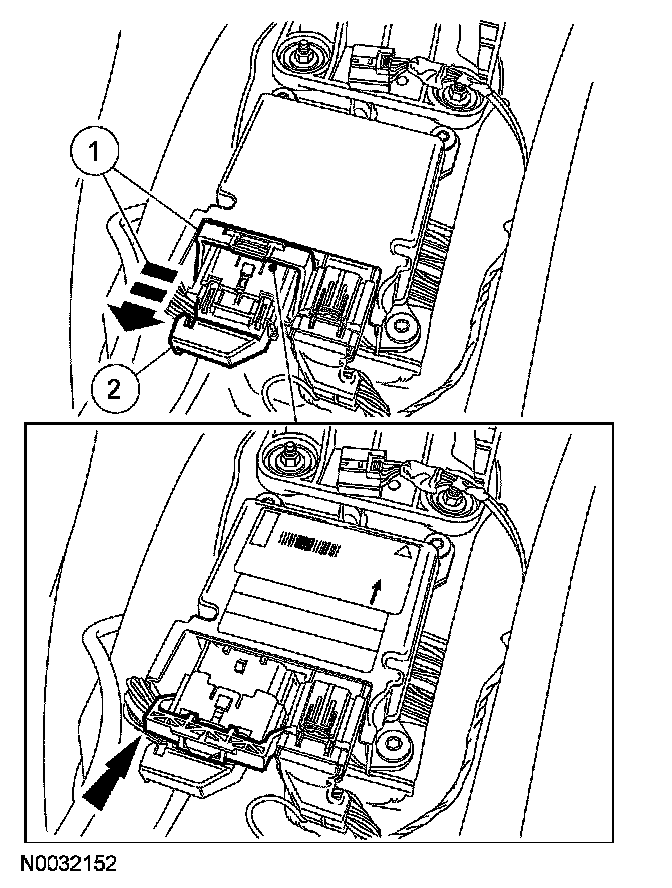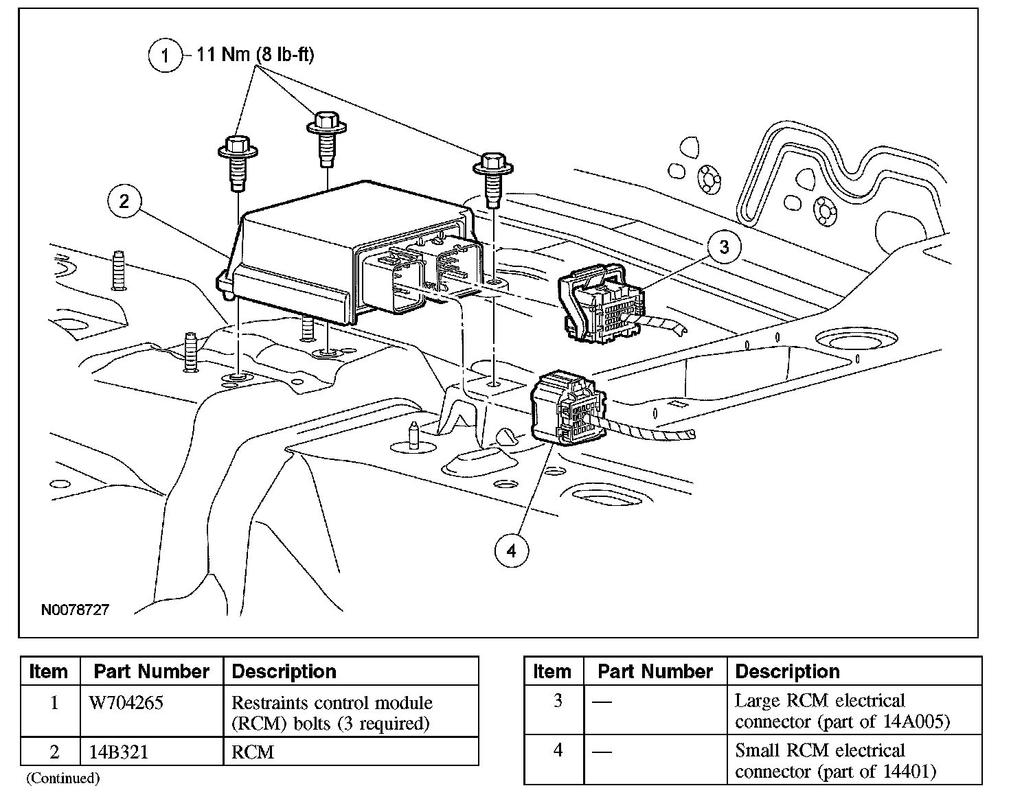 1. WARNING: Always tighten the fasteners of the restraints control module (RCM) and impact sensor (if equipped) to the specified torque. Failure to do so may result in incorrect restraint system operation, which increases the risk of personal injury or death in a crash.