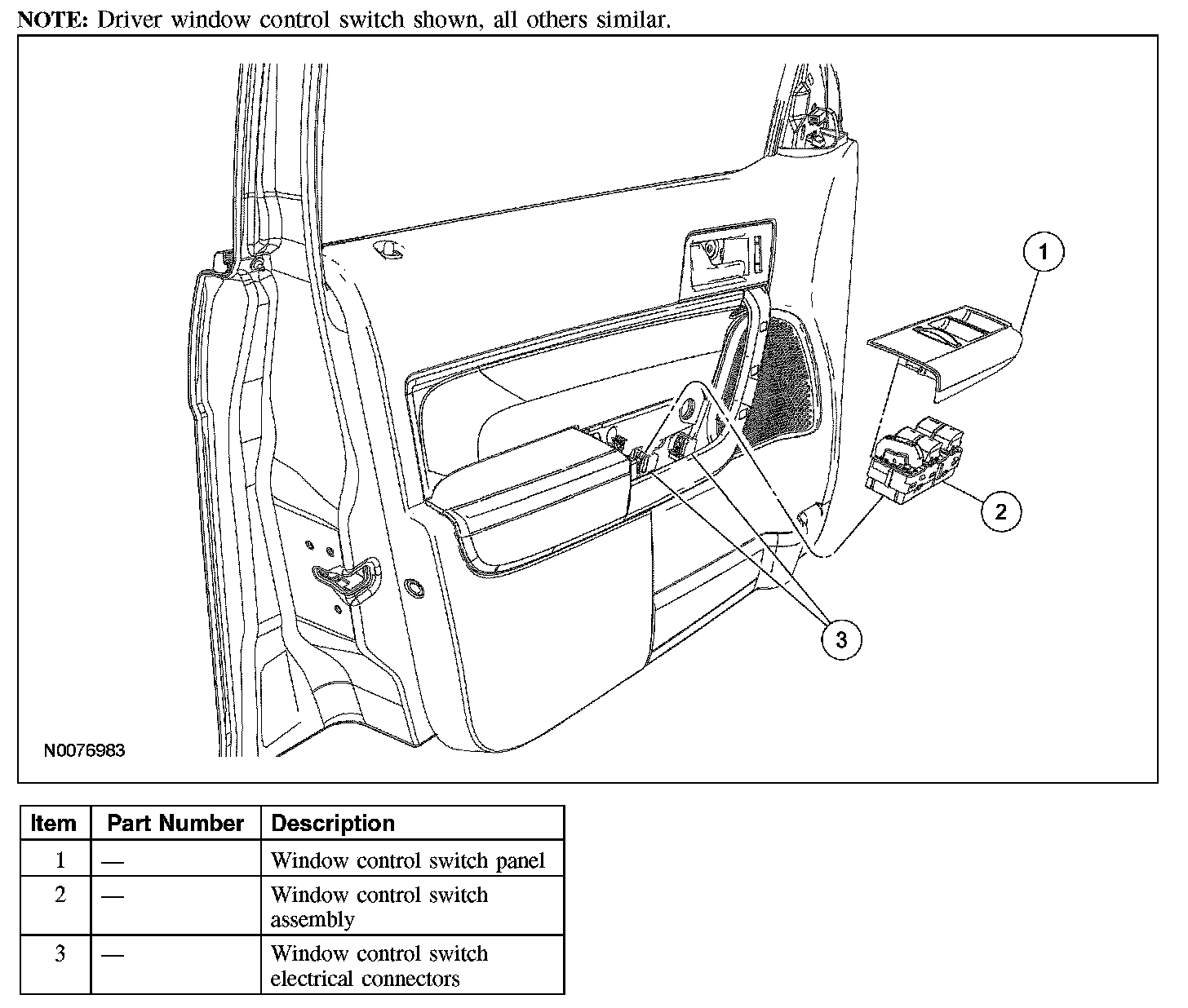 1. NOTE: Front window control switch shown, all others similar.