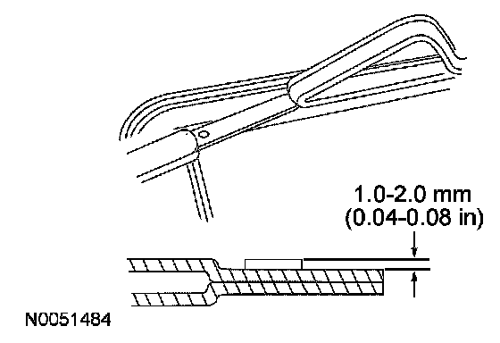Using an appropriate tool, trim the urethane adhesive leaving a 1-2 mm (0.04-0.08 in) base of original equipment urethane on the pinch weld.