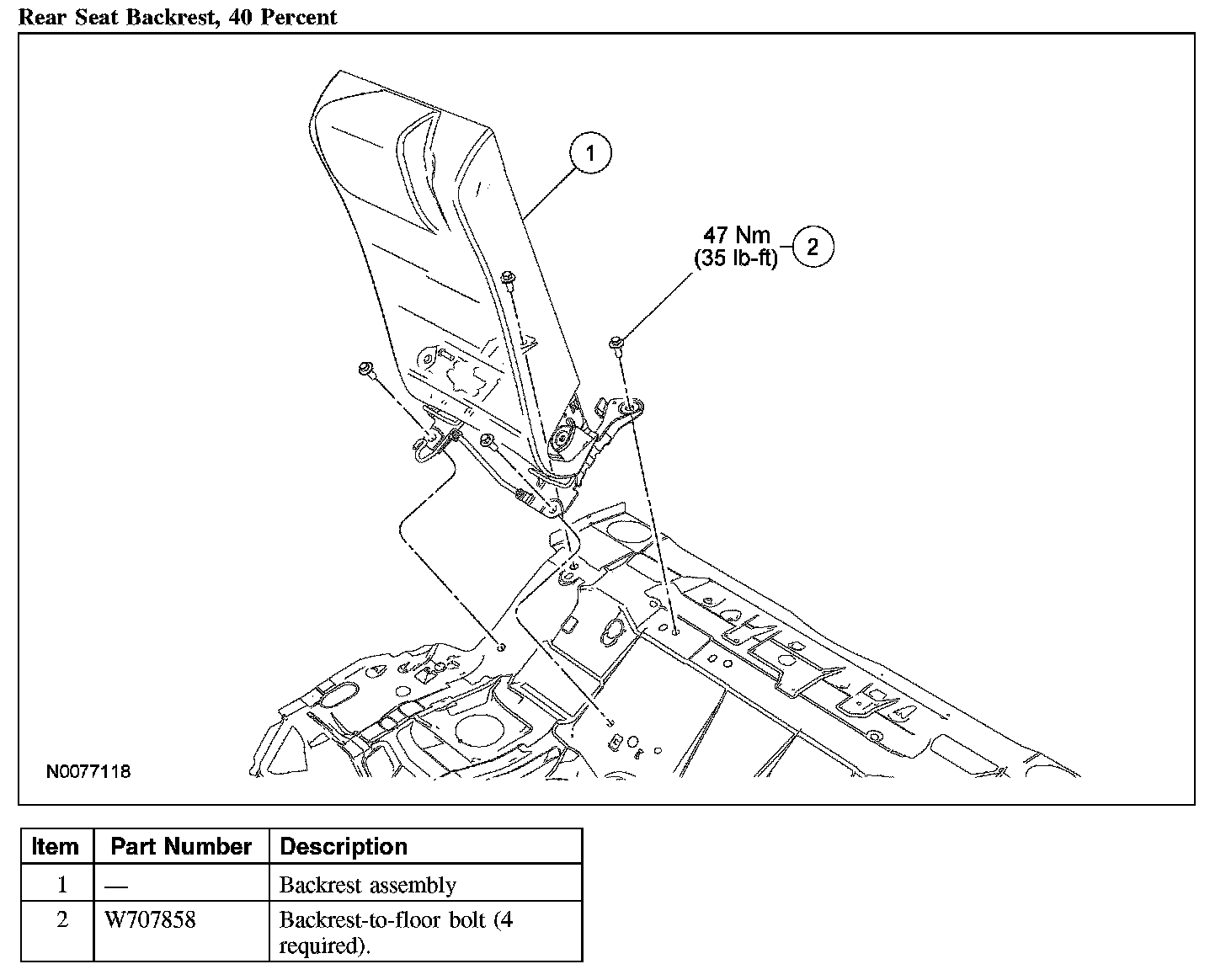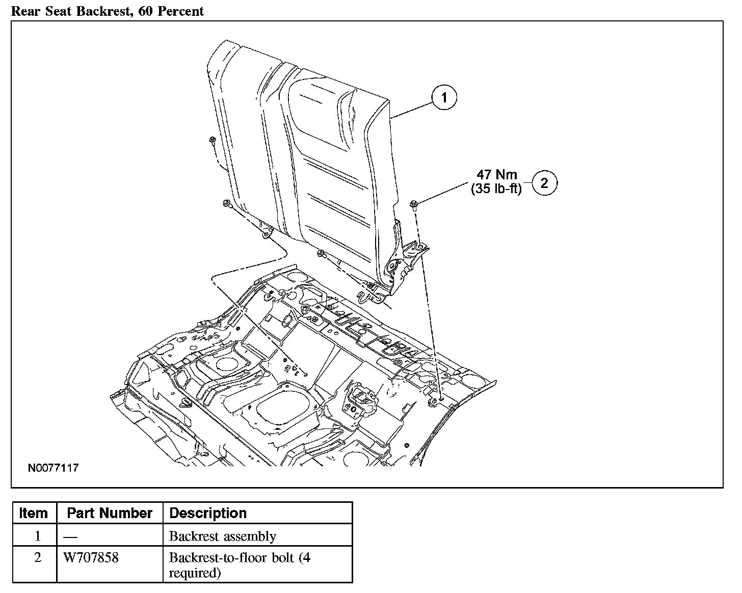 2. Remove the 2 forward backrest-to-floor bolts from the affected rear backrest assembly.