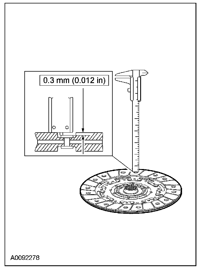 2. Check for a worn clutch disc lining. Measure the minimum allowable depth to the rivet heads with a slide caliper.