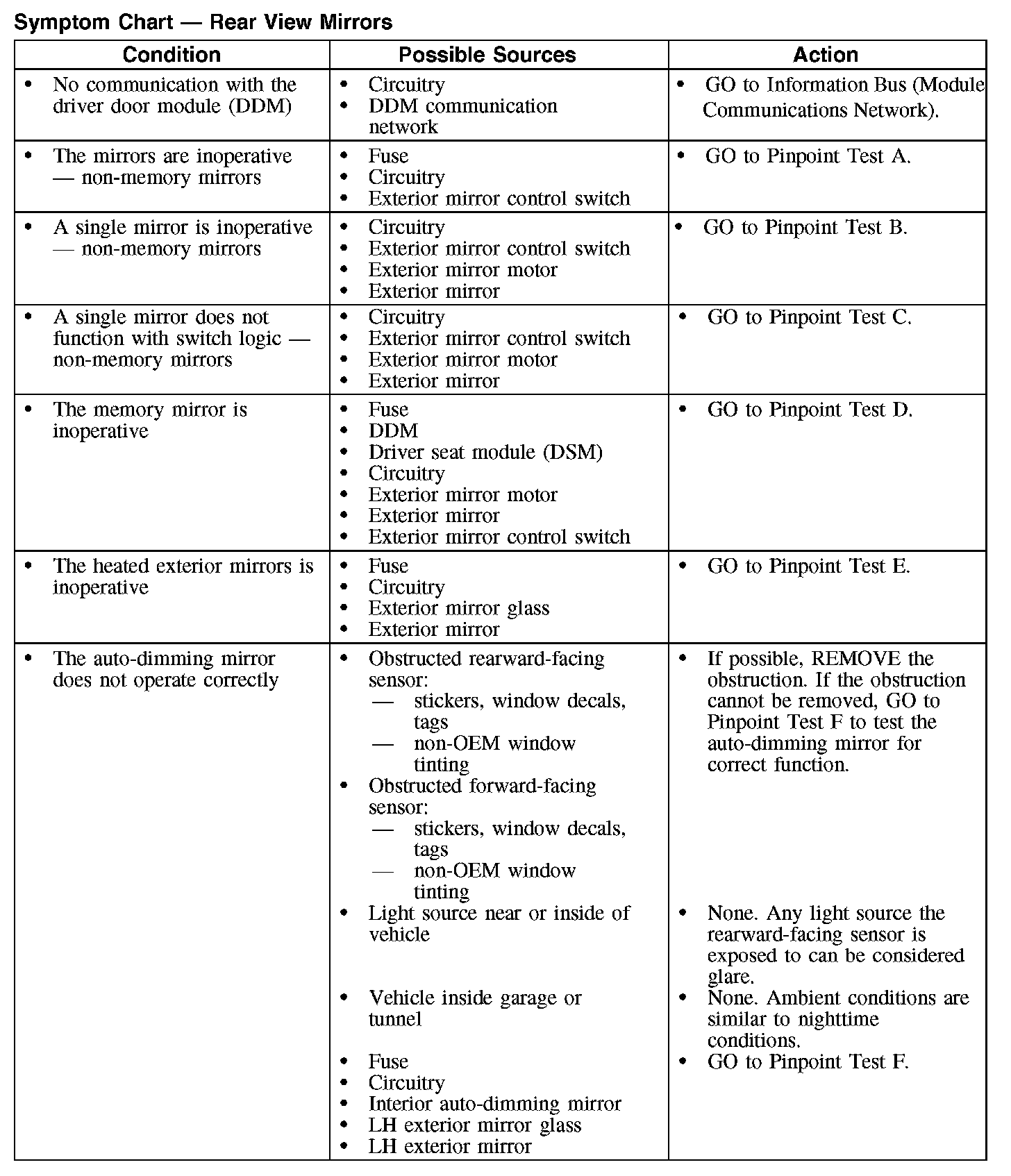 Symptom Chart - Rear View Mirrors