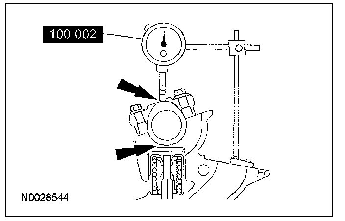 2. Install the special tool so the rounded tip of indicator is on top of the camshaft lobe and on the same plane as the valve tappet (2.3L and 3.5L) or hydraulic lash adjuster (3.0L).