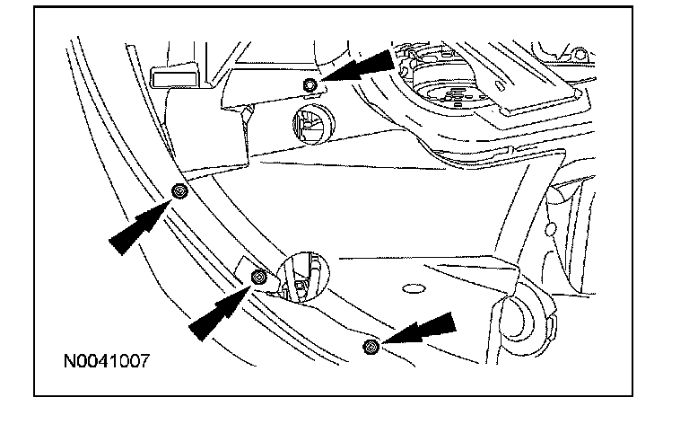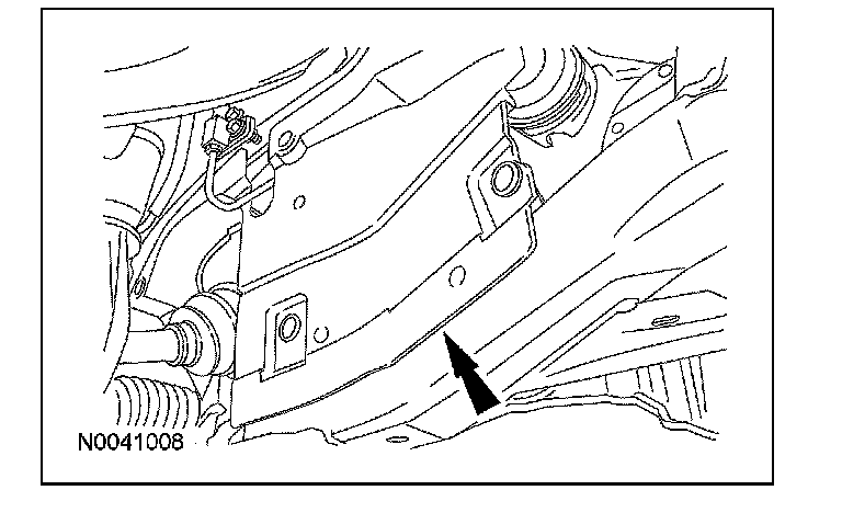 28. Position the LH front structure-to-subframe splash shield in place and install the 6 pin-type retainers.