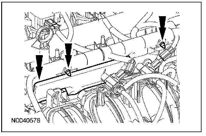 8. Detach the 2 wiring harness pin-type retainers and remove the fuel rail insulator.