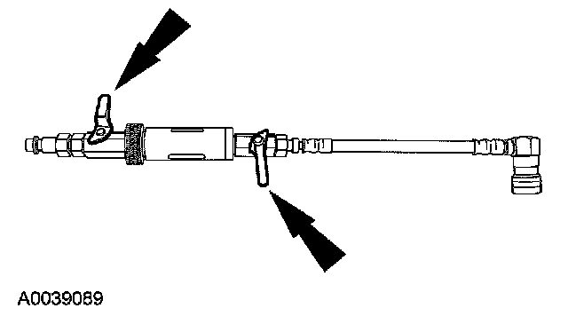 5. Install the dye/lubricant injector between the low-side service gauge port valve and the refrigerant service station or manifold gauge set.