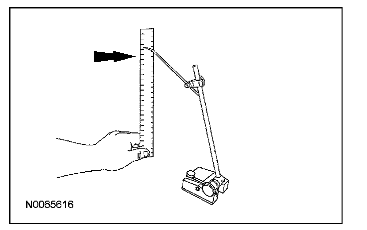 1. Position a suitable surface gauge (such as Starrett 57D Surface Gauge), on a flat, level surface and adjust the gauge's arm until the scriber point is located in the center of the front lower arm-to-subframe bolt.