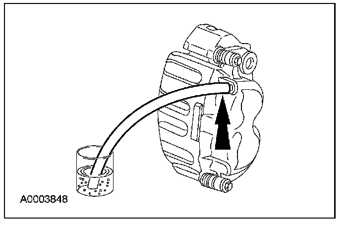 9. Loosen the RH front brake caliper bleeder screw until a stream of brake fluid comes out. While the assistant maintains pressure on the brake pedal, tighten the bleeder screw.