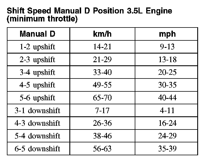 Shift Speed Manual D Position 3.5L Engine (minimum throttle):