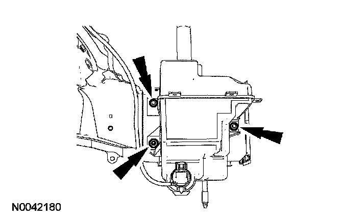 6. Remove the windshield washer reservoir fasteners and the windshield washer reservoir.