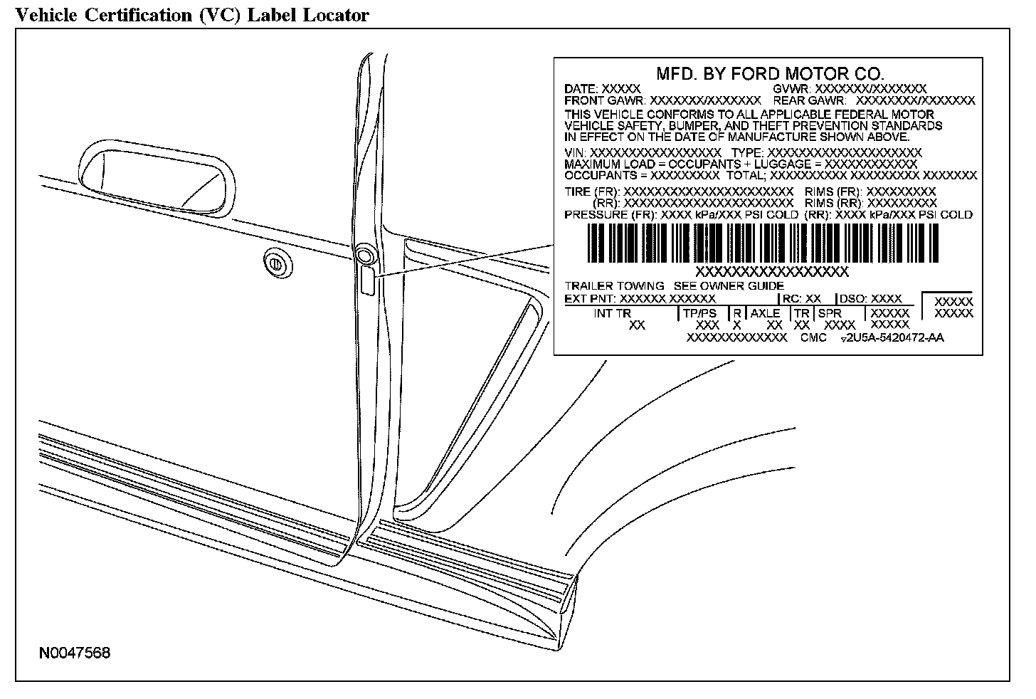 The upper portion of the VC label contains the manufacturer name, the month and year of manufacture, the certification statement and the VIN. It also includes gross vehicle weight ratings (GVWR). The VC label is located on the LH door jamb.