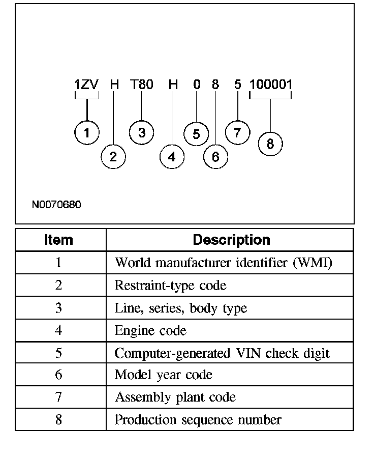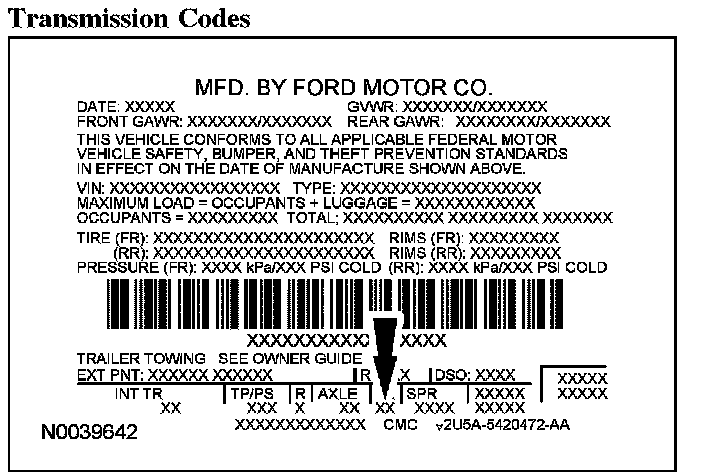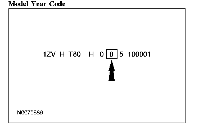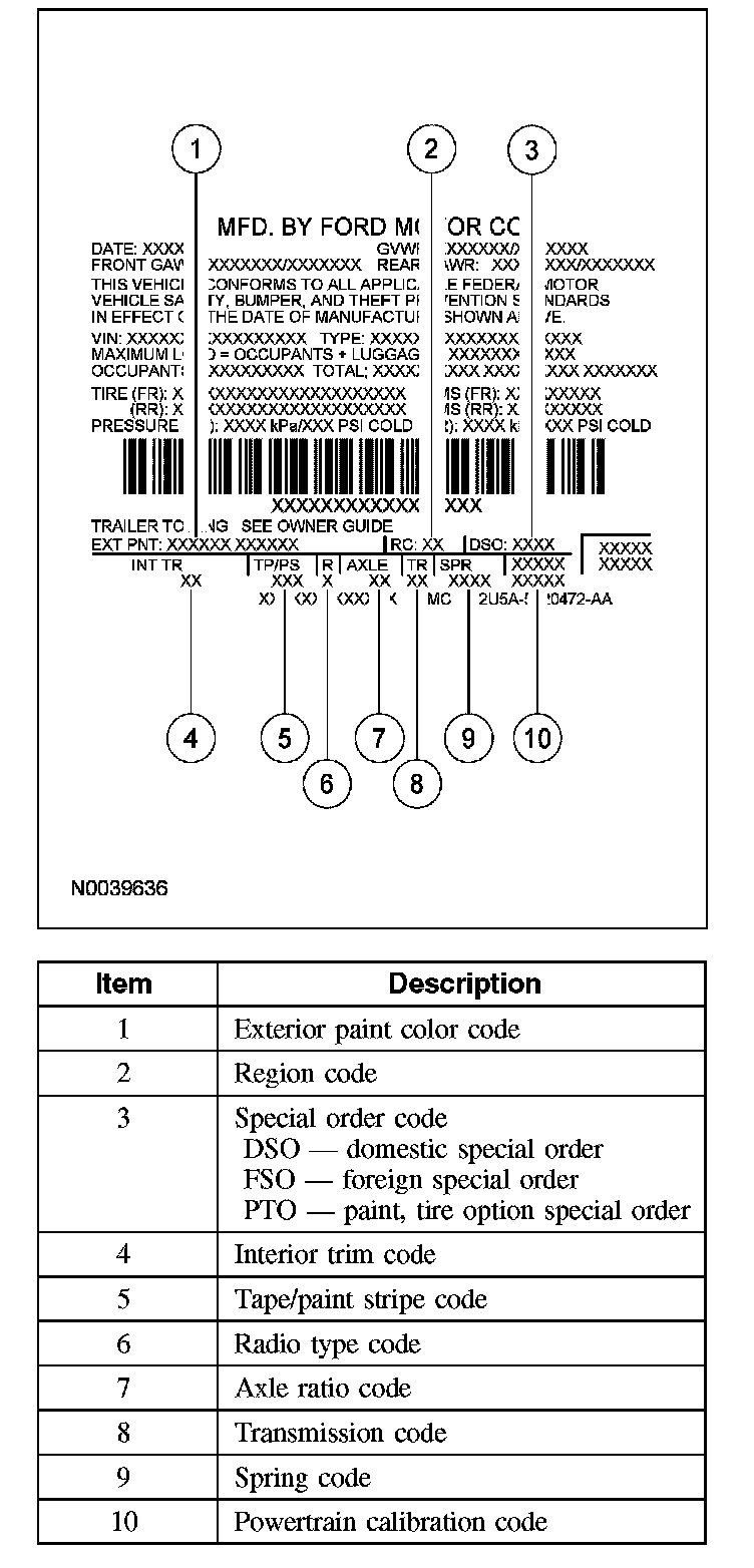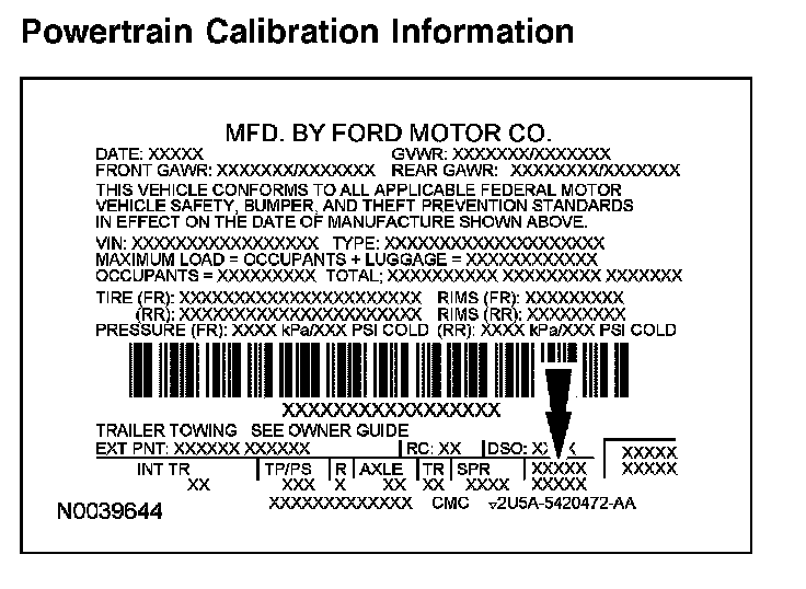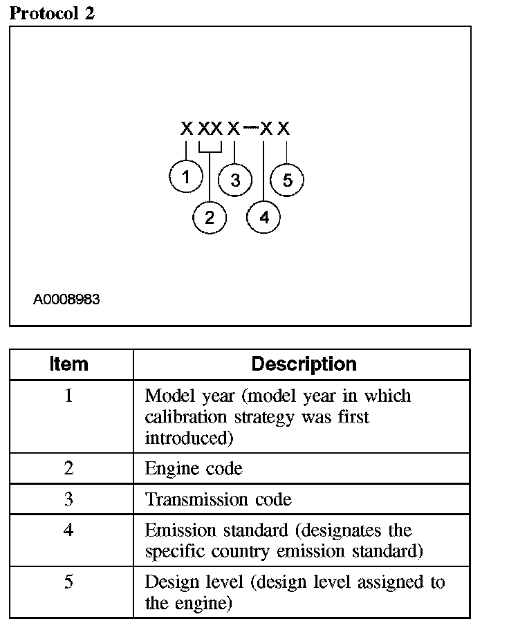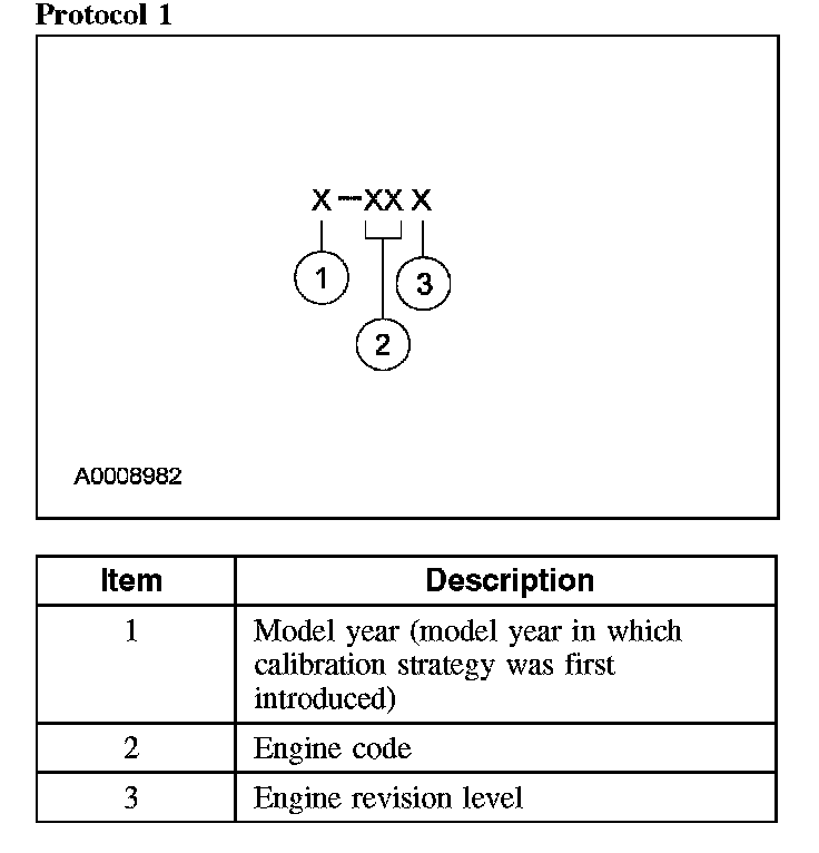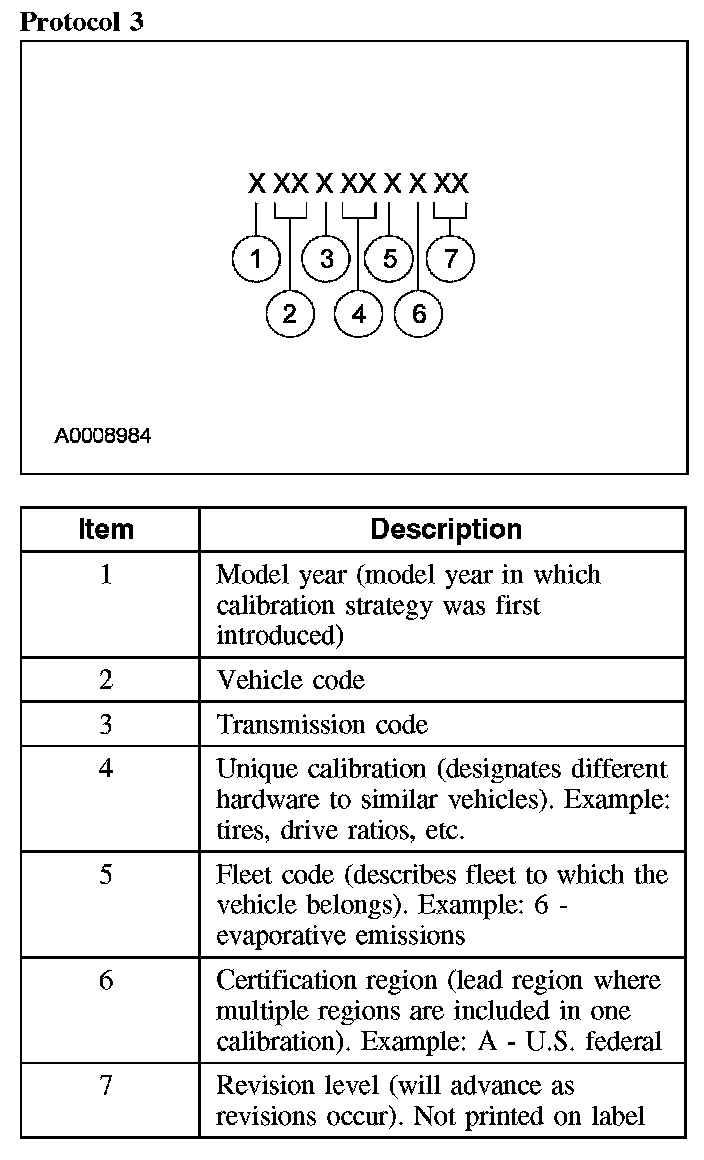 Powertrain calibration information is printed in the lower right corner of the VC label. Only the base calibration information is printed. Revision levels will not appear, however, this information can be found in OASIS. For the current model year, Ford Motor Company is using 3 different protocols which describe powertrain base calibration. These protocols are designed to provide worldwide standardization for vehicle calibration. If the electronic calibration strategy has been used since 1998 and carried into the current model year, Protocol 1 will be used. Refer to Protocol 1 below. If the electronic calibration strategy has been used since 1999 and is carried into the current model year, Protocol 2 will be used. Refer to Protocol 2 below. For new electronic calibration strategies introduced since the 2000 model year, use Protocol 3. Refer to Protocol 3 below.