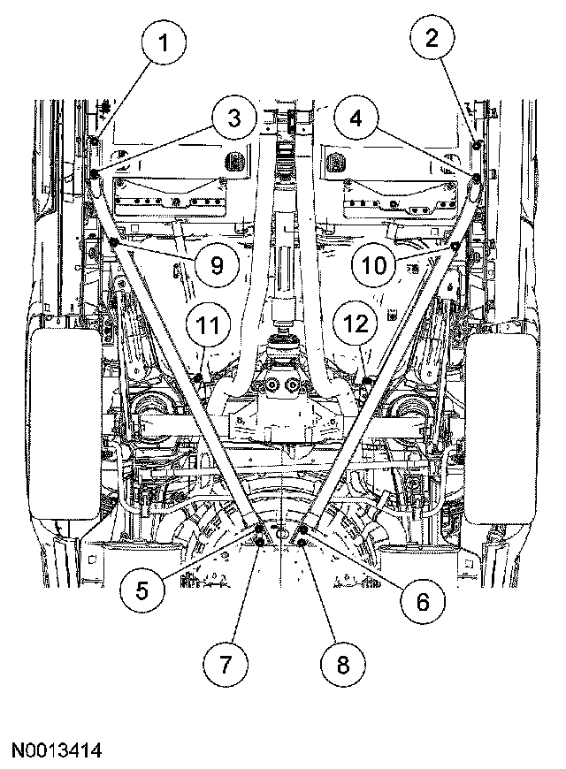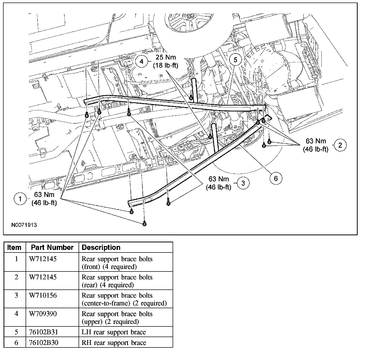 - Tighten the 2 rear support brace bolts (center-to-frame) to 63 Nm (46 lb-ft).