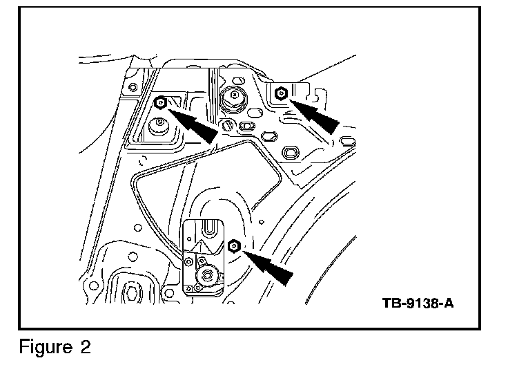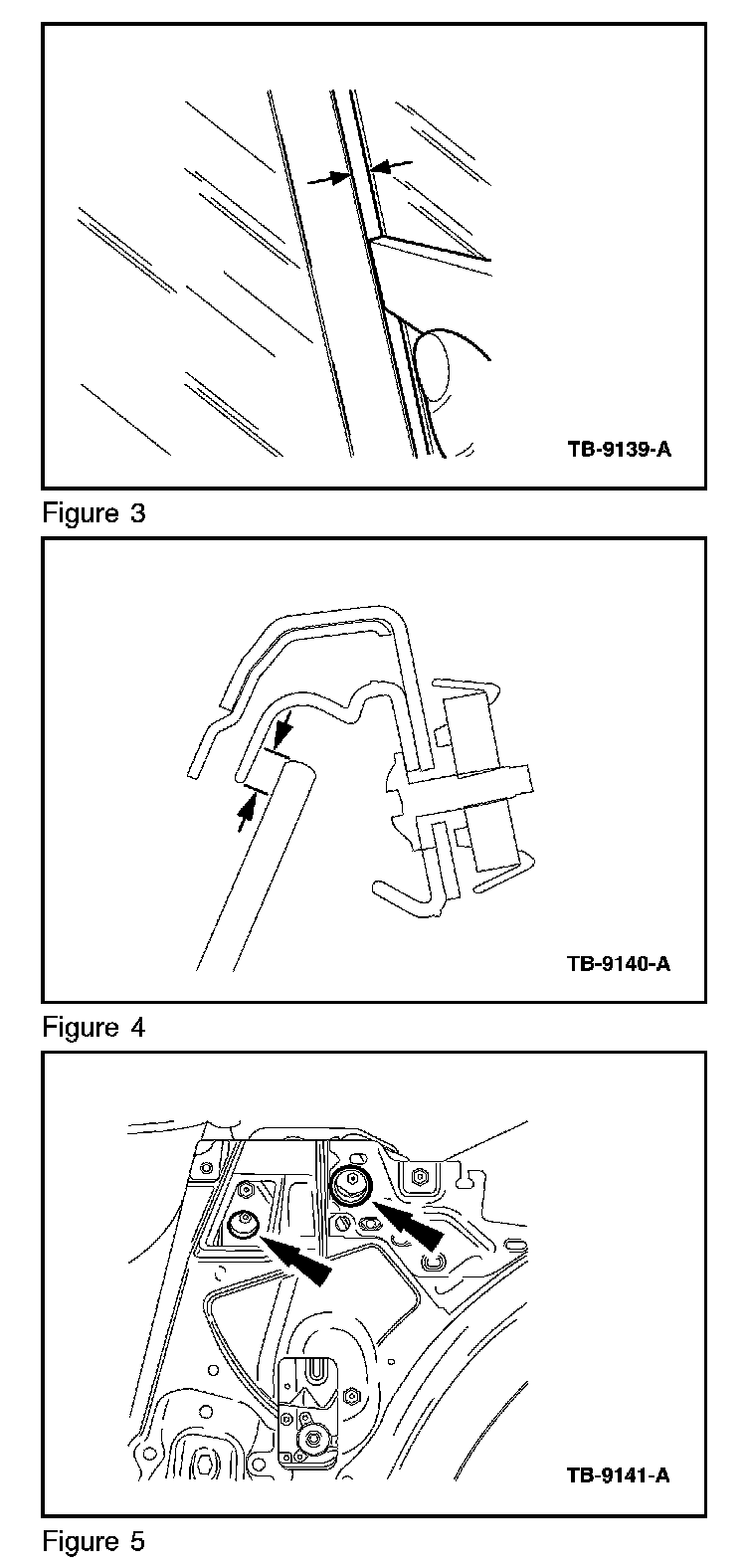 3. Adjust quarter glass so that a constant 5/32"-1/4" (4-6 mm) gap exists between the division bar and the door glass. Also, adjust so that the glass is inset 5/32" - 1/4" (4-6 mm) inside the weatherstrip retainer. Apply tape to top exterior side of quarter glass. Mark a 5/32" - 1/4" (4-6 mm) line on the tape as a visual aid in adjusting the glass inset to weatherstrip retainer. Use quarter glass attaching screws to adjust the glass. Loosen both screws and move the glass in plane as needed. (Figures 3 - 5)