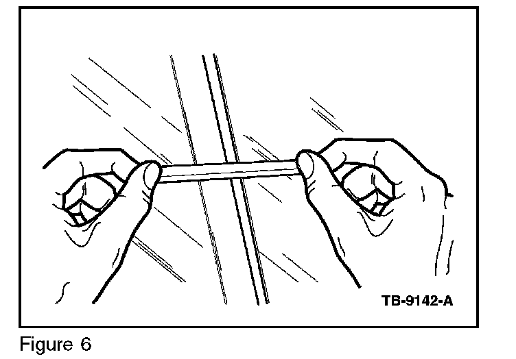 5. Adjust the door glass so that the door glass is flush to the quarter glass division bar or outboard of the division bar by no more than 1/16" (2 mm). (Figure 6). Use the door glass window regulator jack screw to adjust glass outboard. Remove the round reflector located at the bottom of the door trim panel. Turning the jack screw clockwise tips the glass outboard, counterclockwise tips the glass inward. If additional adjustment is needed, then remove trim panel and use glass clamps. Refer to WSM, Section 501-11.