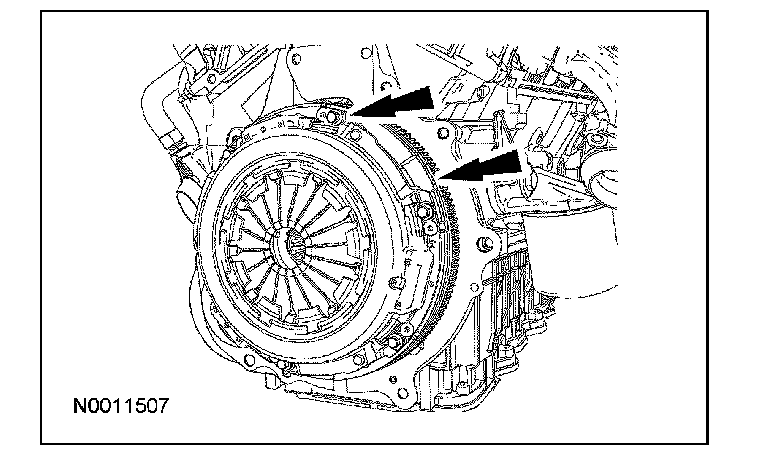 Remove the 6 pressure plate bolts, then remove the pressure plate and the clutch disc. Discard the pressure plate bolts.