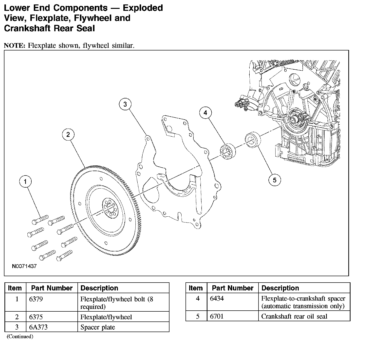 FlywheelLower End Components - Exploded View, Flexplate, Flywheel and Crankshaft Rear Seal: