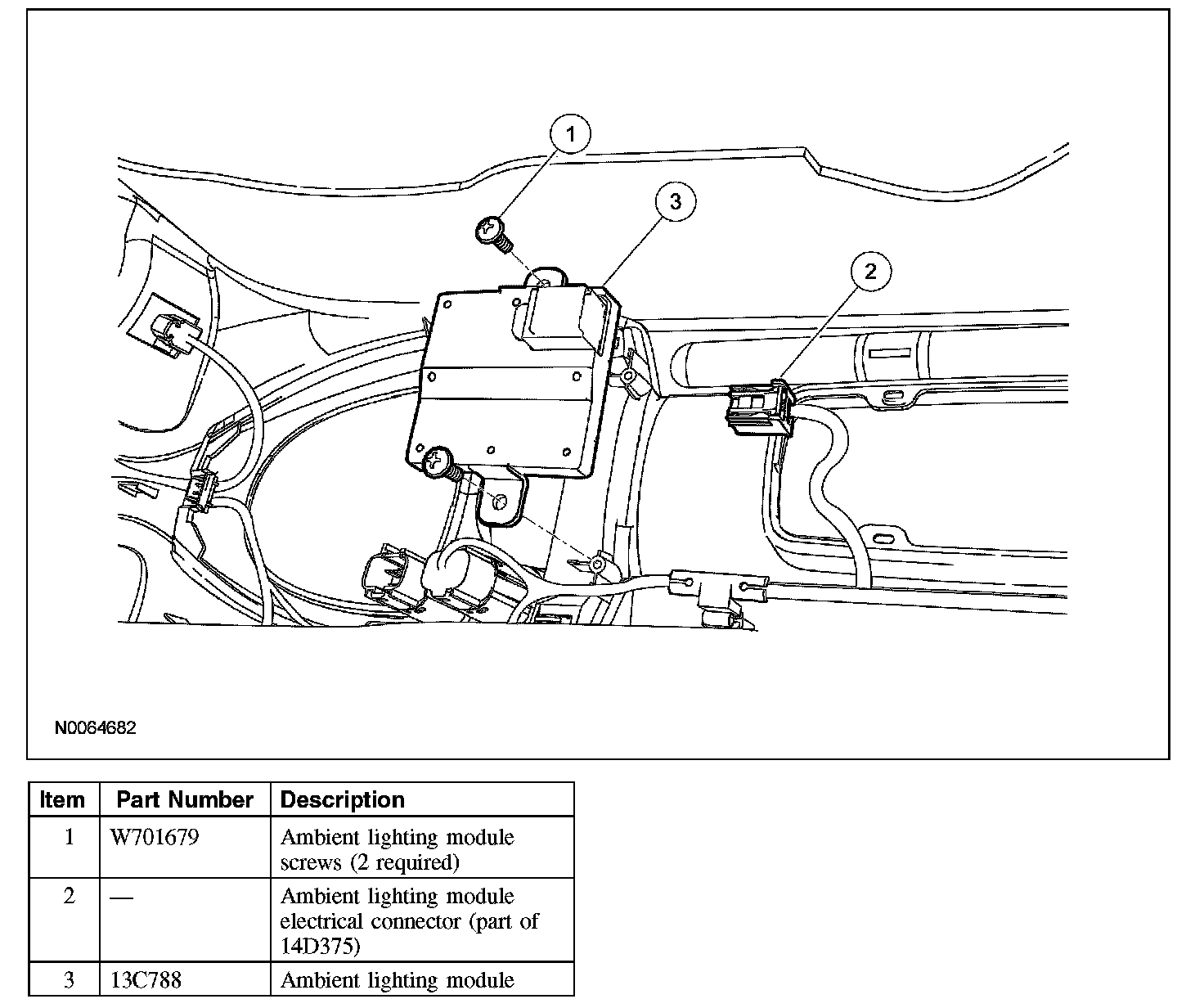 NOTE: The ambient lighting module is mounted under the bottom of the floor console finish panel cup holder.