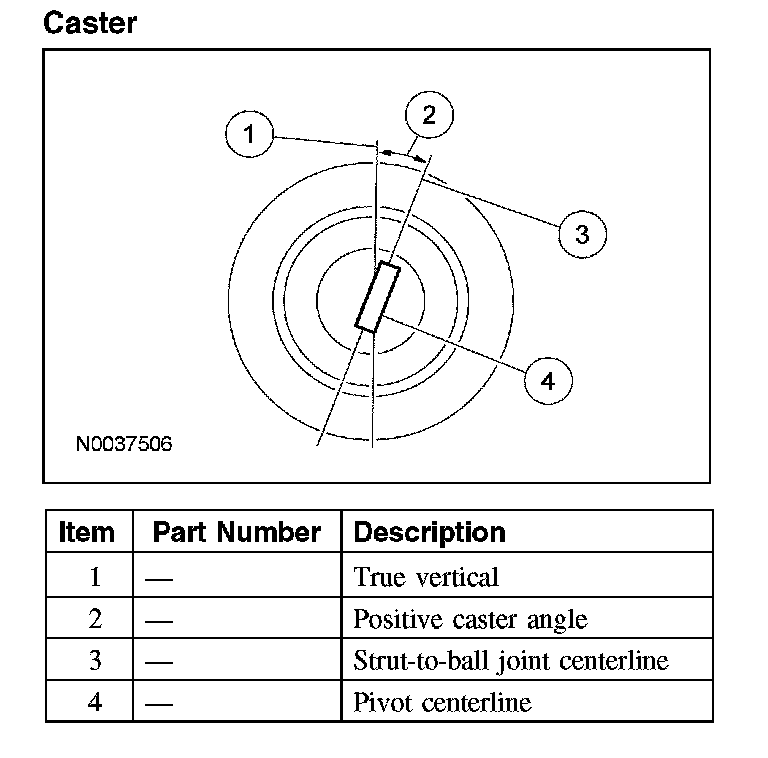 Caster is the deviation from vertical of an imaginary line drawn through the pivot points (top of strut and lower ball joint), when viewed from the side. The caster specifications will give the vehicle the best directional stability characteristics when loaded and driven. The caster setting is not related to tire wear.