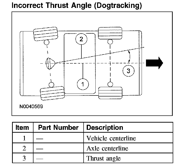Incorrect thrust angle (also known as dogtracking) is the condition in which the rear axle is not square to the chassis. Heavily crowned roads can give the illusion of dogtracking.