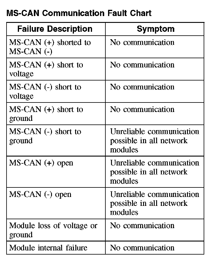 The following fault chart describes the specific MS-CAN failures and their resulting symptom: