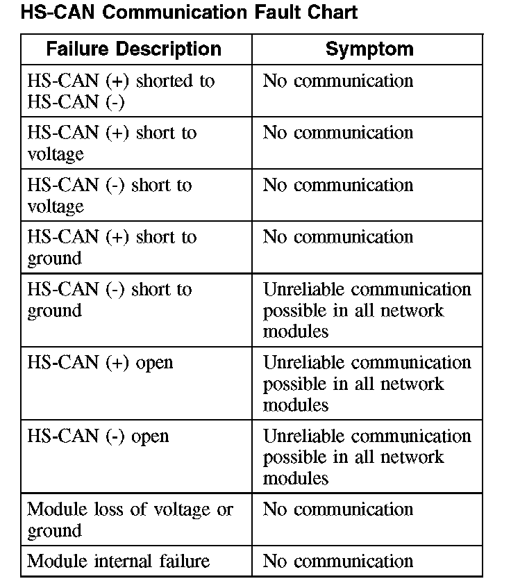 The following fault chart describes the specific HS-CAN failures and their resulting symptom: