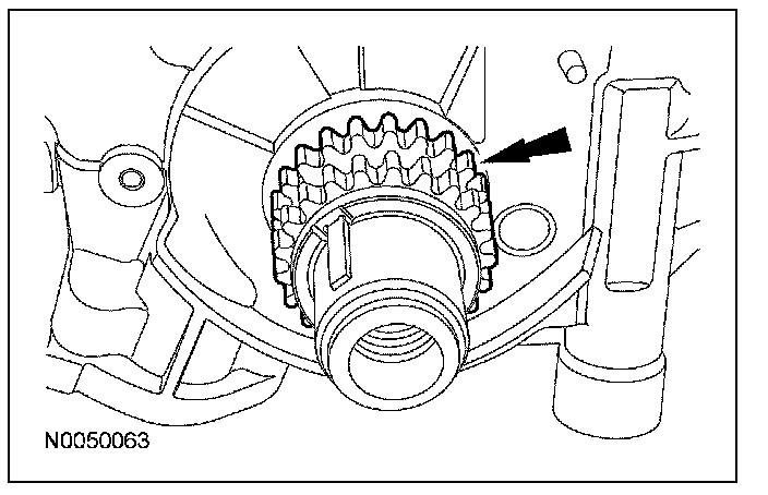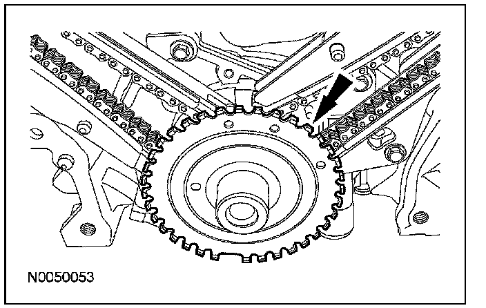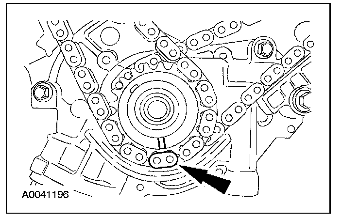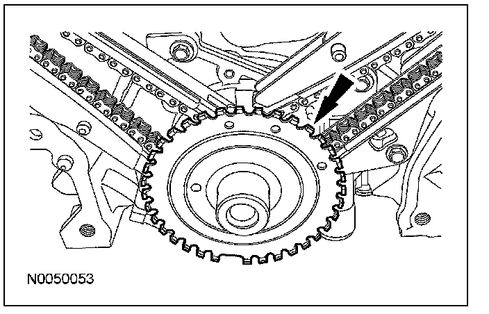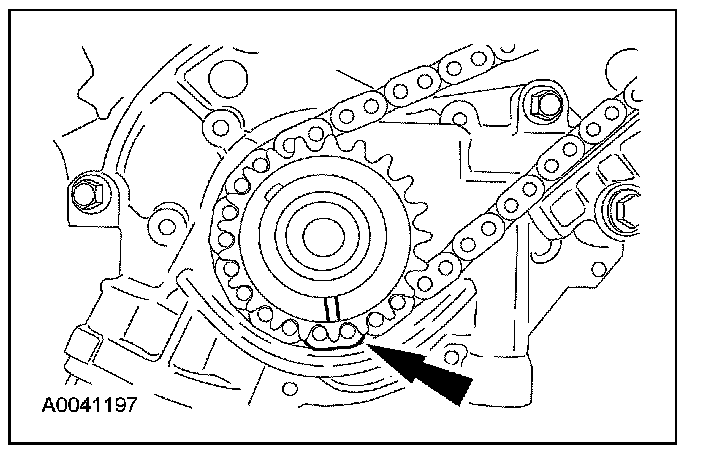 10. Position the LH (inner) timing chain onto the crankshaft sprocket, aligning the one colored link on the timing chain with the slot on the crankshaft sprocket.