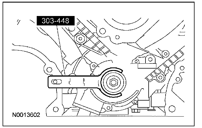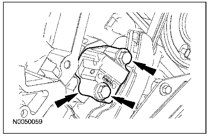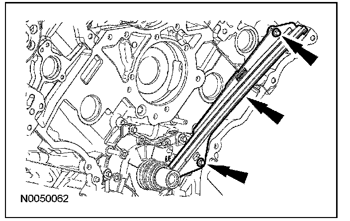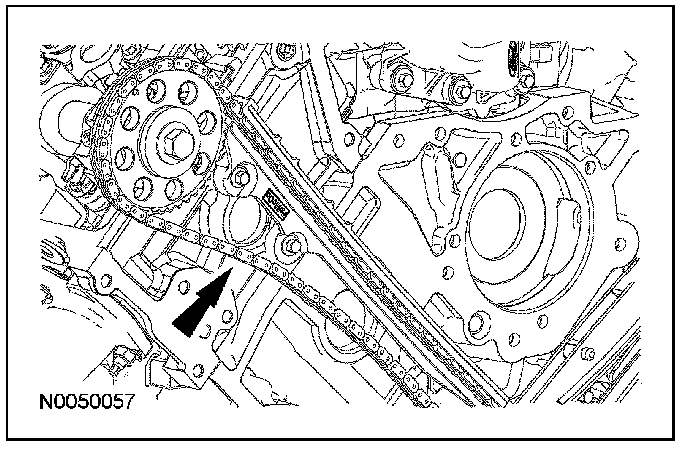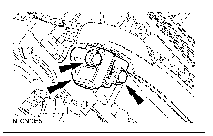 13. Install the LH primary timing chain tensioner and the 2 bolts.