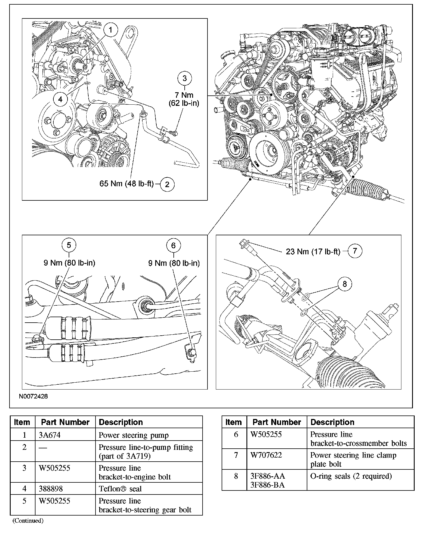 8. CAUTION: When installing the pressure and return lines to the steering gear, make sure the lines are fully seated into the steering gear prior to installing the clamp plate. Additionally, make sure that the clamp plate surfaces are free of foreign material and debris. DO NOT exceed the specified torque when tightening the clamp plate. Leakage and/or premature failure of the power steering components may occur.