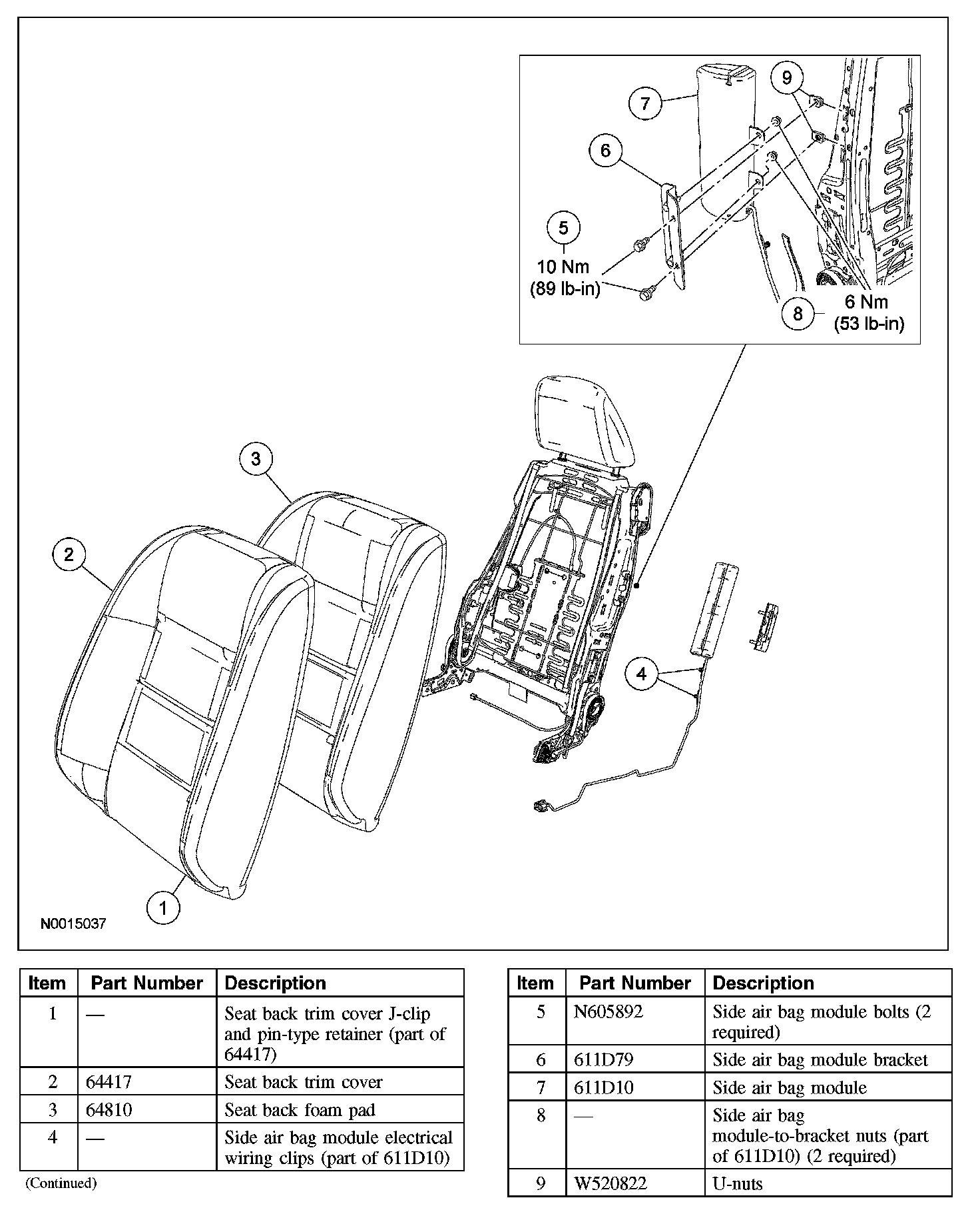 - If a side air bag deployment took place, a new seat back foam pad, trim cover, side air bag module, bracket and nuts, U-nuts and bolts must be installed. The seat back frame should be replaced if necessary.