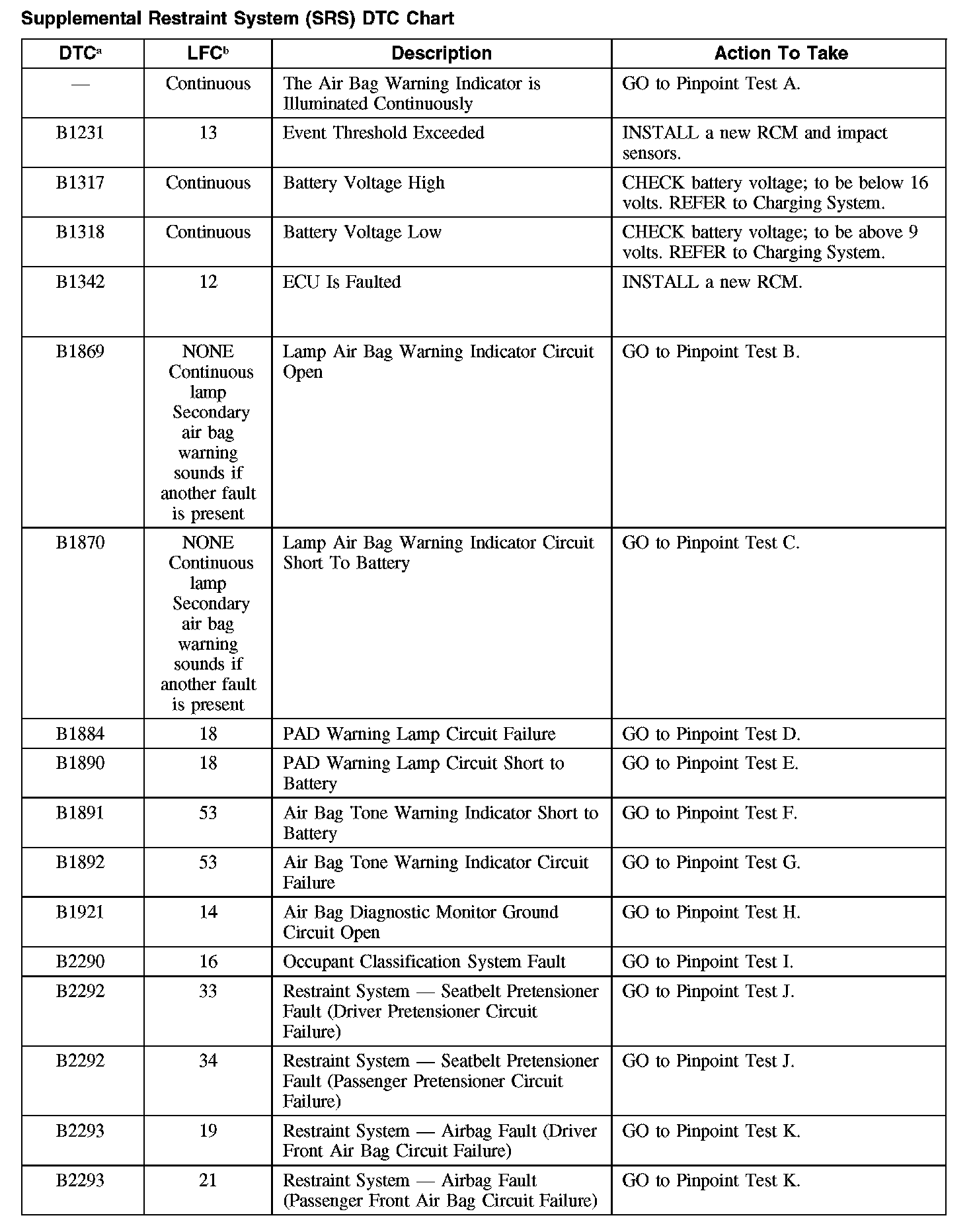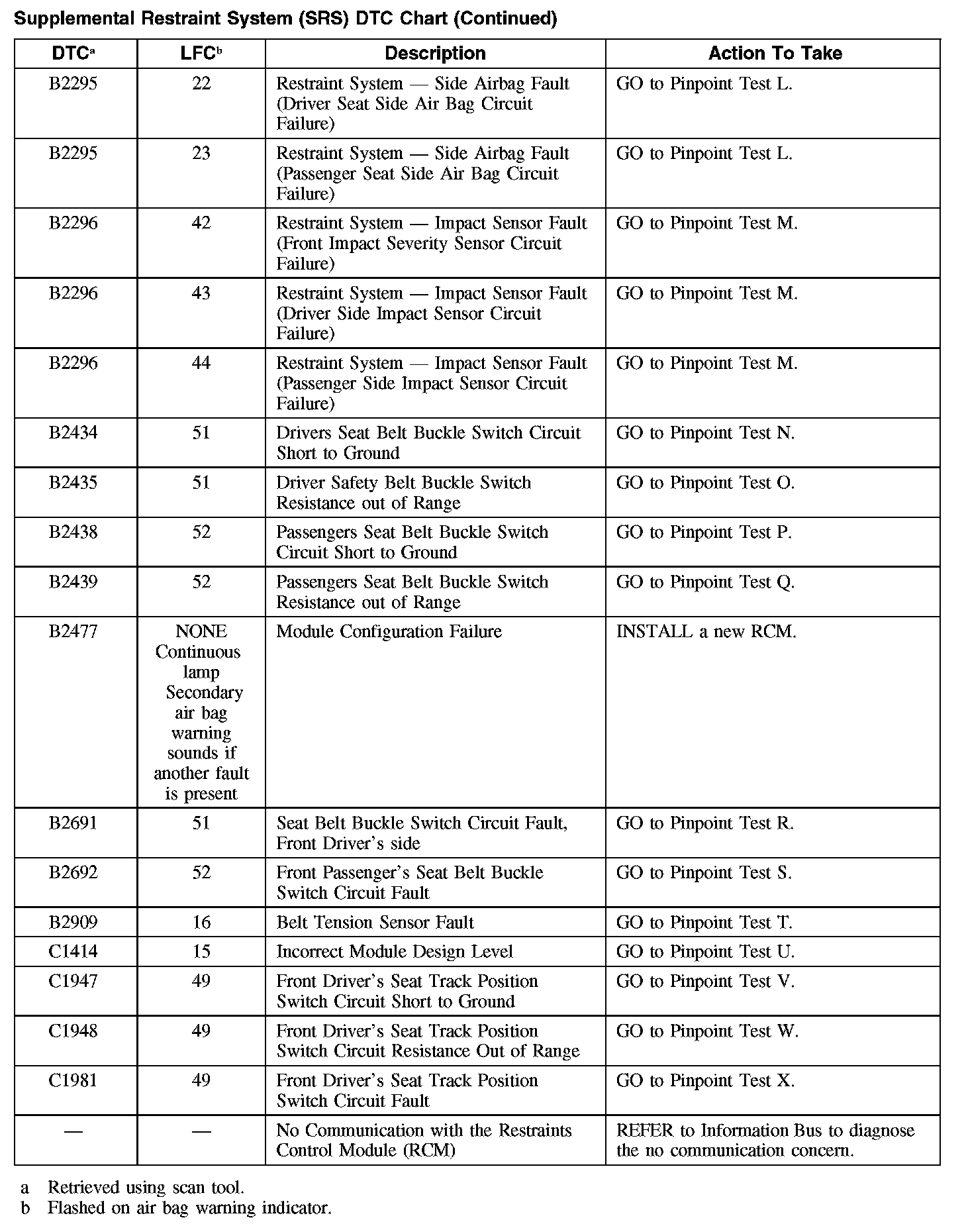 SUPPLEMENTAL RESTRAINT SYSTEM (SRS) DTC CHARTWhile the LFCs are an indication of a general concern in the passive restraints system, the DTCs are more specific. The DTCs can be retrieved from the restraints control module (RCM) with a scan tool via the data link connector (DLC).