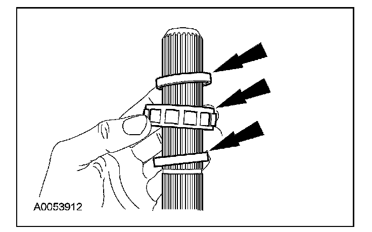 49. Position the check ball on the shaft. Install the output shaft speed (OSS) sensor tone wheel. Install a new OSS sensor tone wheel retaining ring.