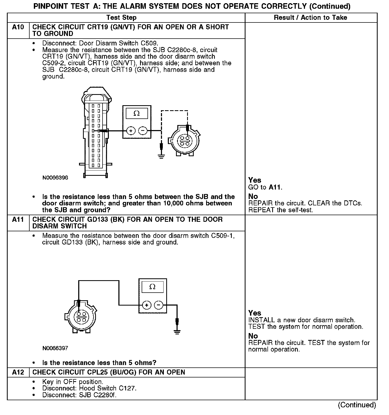 The SJB monitors the door disarm switch on circuit CRT19 (GN/VT). When the door lock cylinder is turned to unlock, the door disarm switch completes the ground through circuit GD133 (BK). This signals the SJB to cancel the alarm function.
