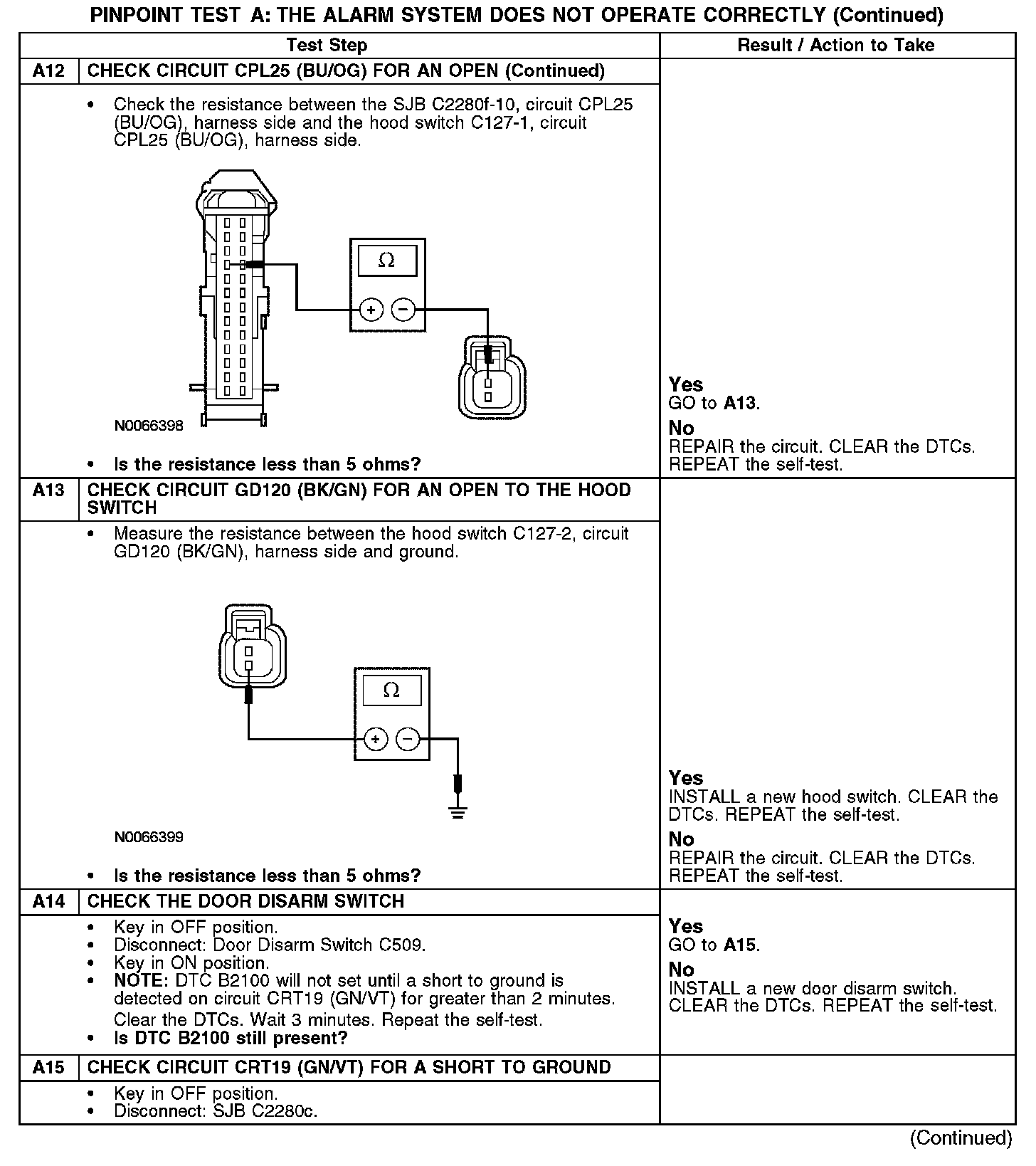 The SJB monitors the hood switch on circuit CPL25 (BU/OG). When an unauthorized intrusion to the engine compartment occurs, the hood switch removes the ground from circuit GD120 (BK/GN), and the SJB activates the vehicle alarm.